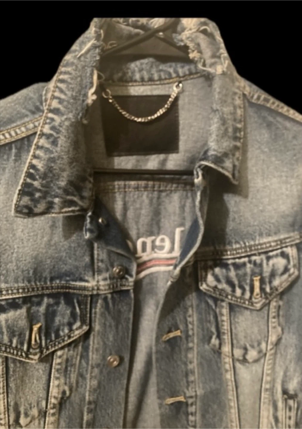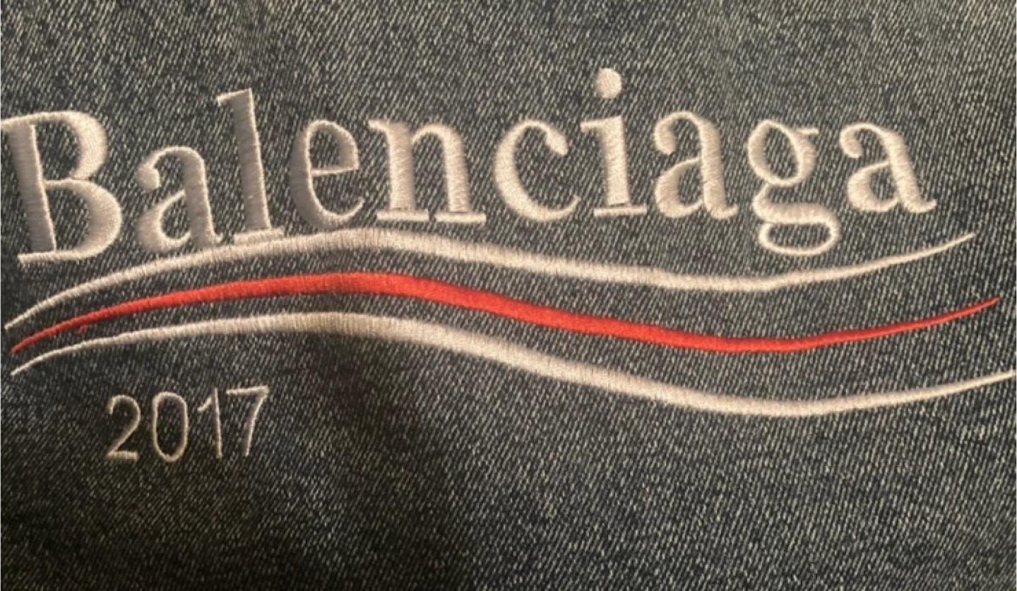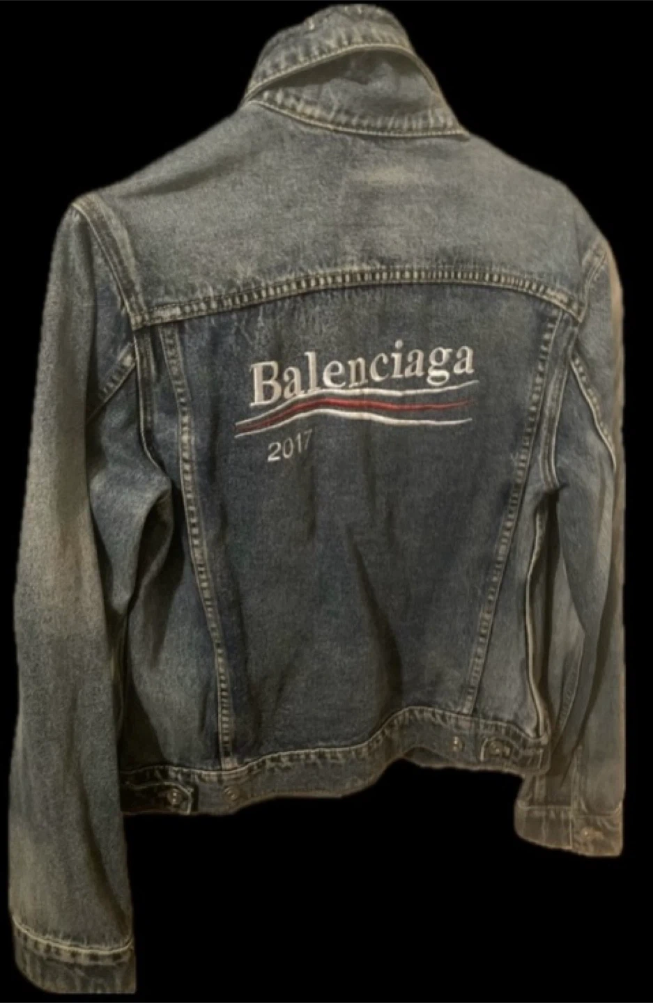 Blue denim jacket with embroidered Balenciaga logo and "2017" on the back. It's made of cotton. Classic trucker style with button closure and chest pockets.