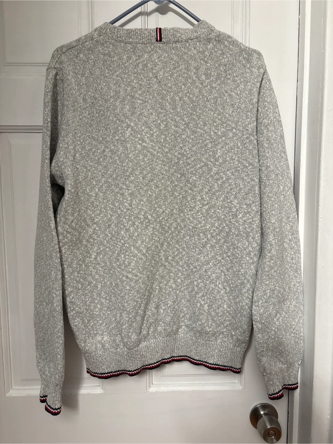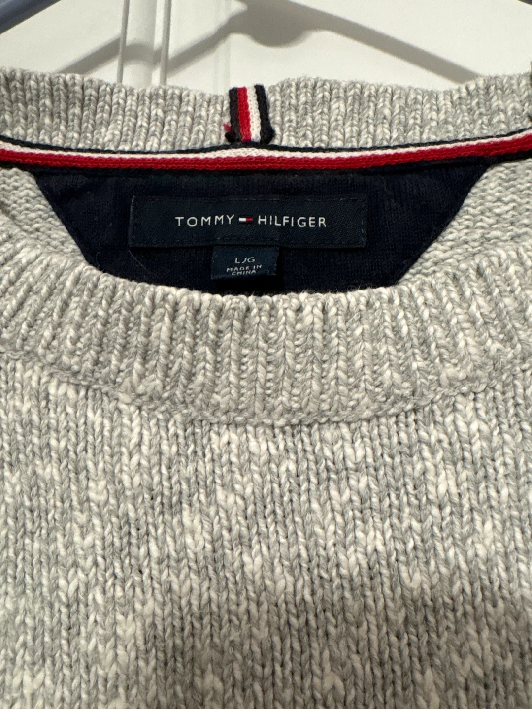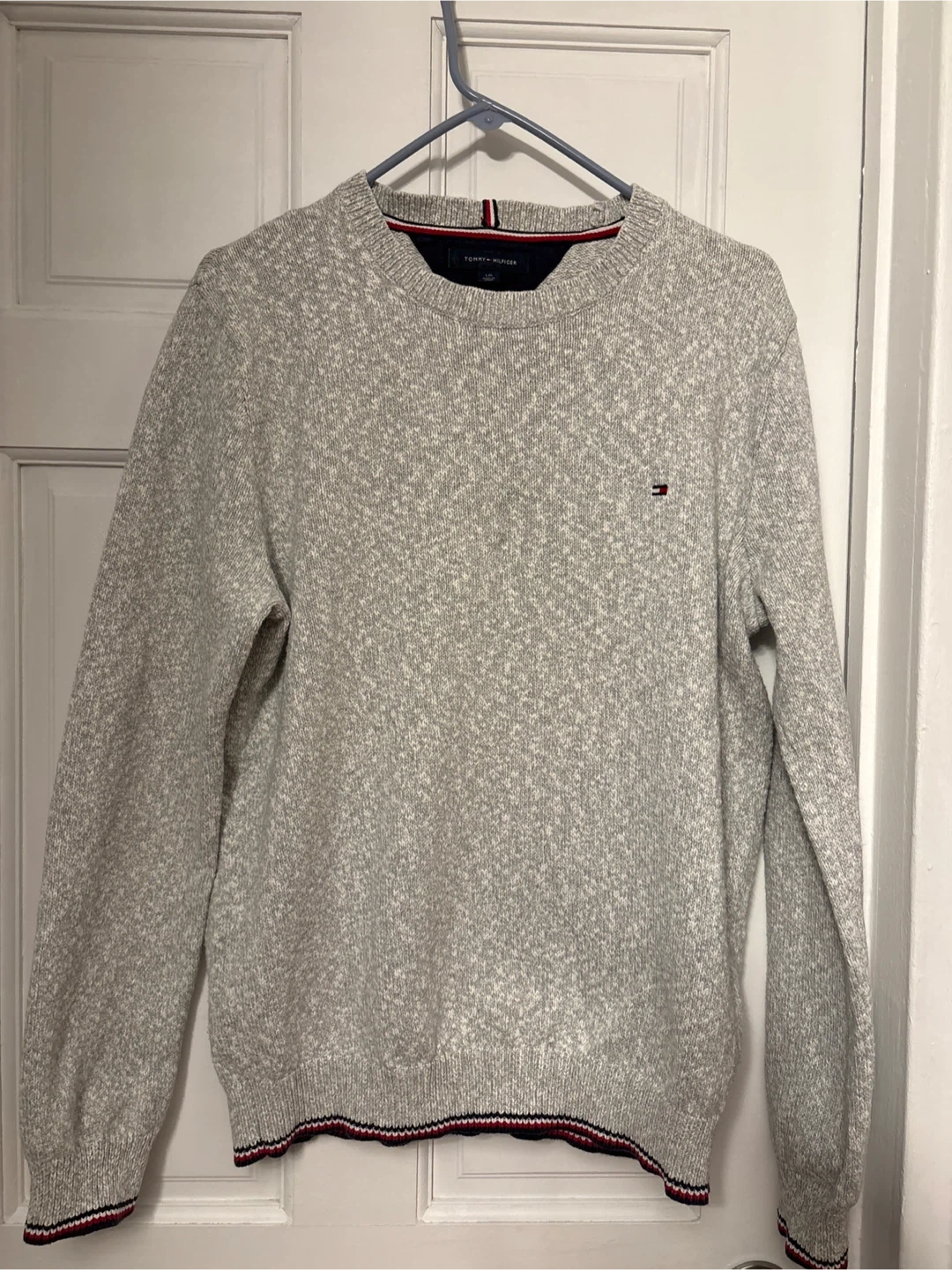 This Tommy Hilfiger crewneck sweater is a light gray marled knit. It features a small embroidered flag logo on the chest and striped trim on the collar, cuffs, and hem. Size is L/G.