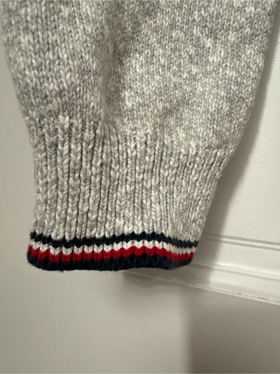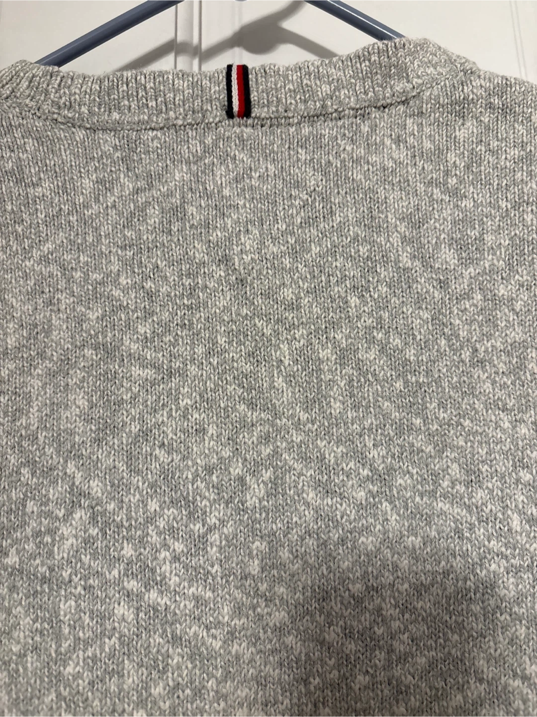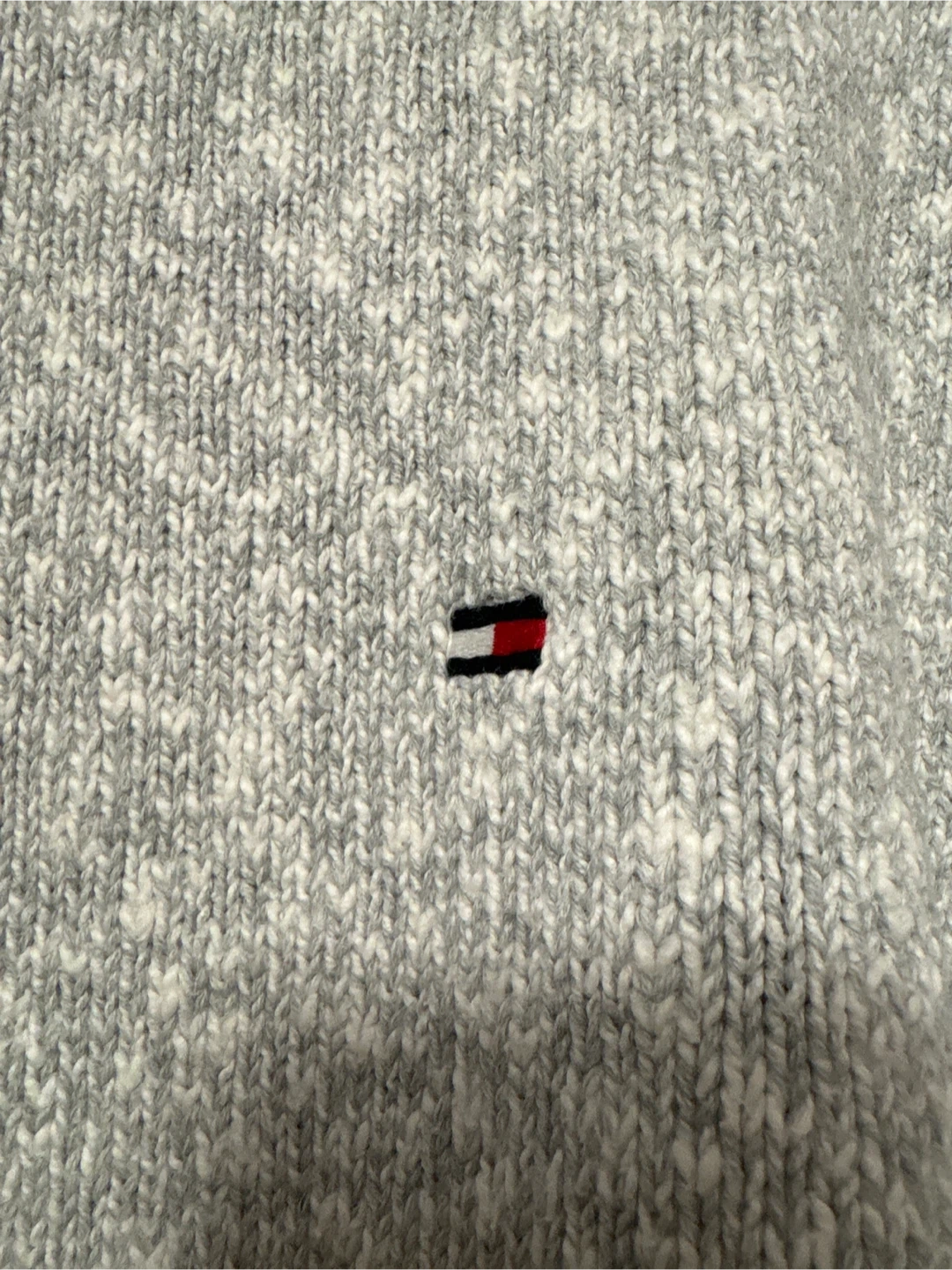 This Tommy Hilfiger crewneck sweater is a light gray marled knit. It features a small embroidered flag logo on the chest and striped trim on the collar, cuffs, and hem. Size is L/G.
