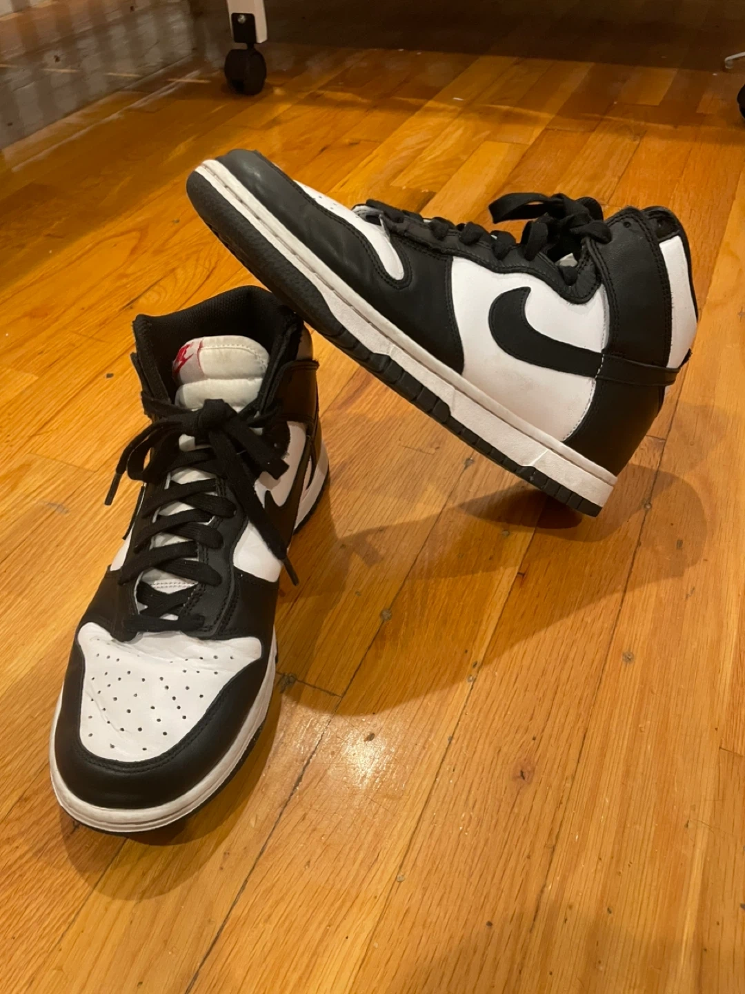 These are Nike Dunk High sneakers in a classic black and white colorway. They're a size 9.5 (US). Leather and synthetic materials. These are ready for your next skate session or casual wear!