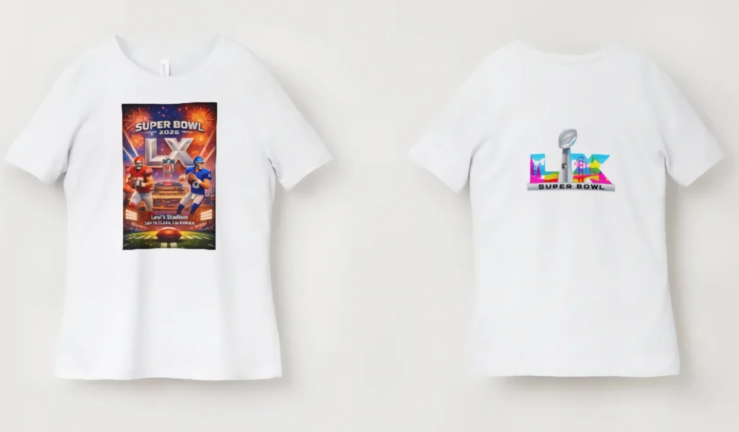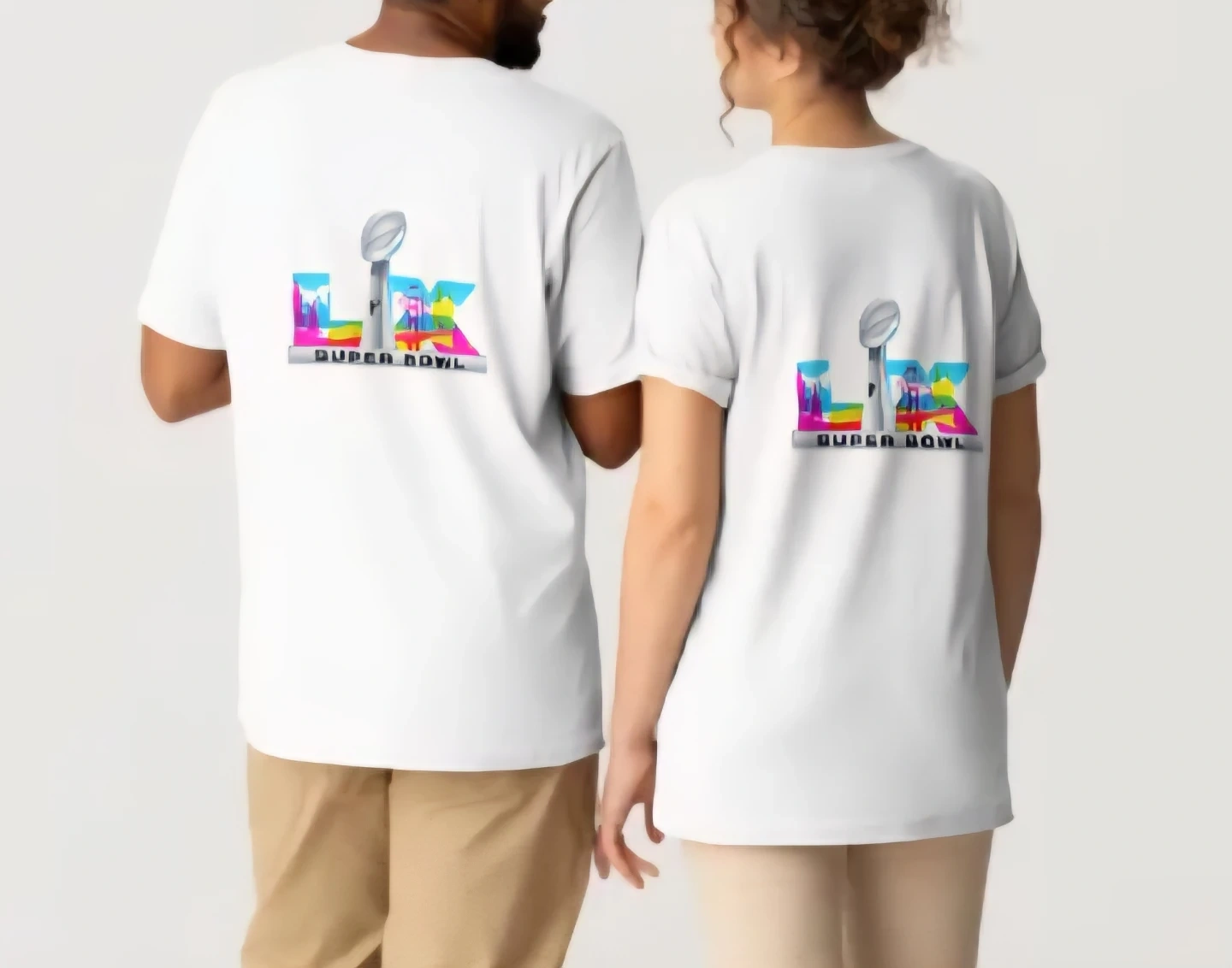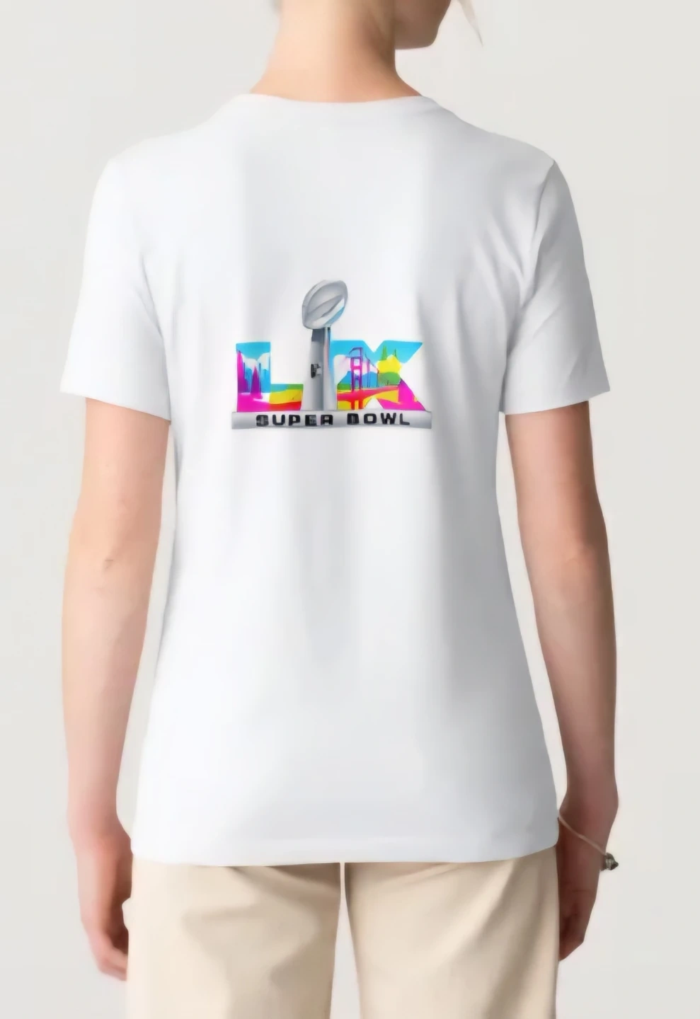 White t-shirt featuring the Super Bowl LIX logo and graphics on the back. The front shows a Super Bowl 2026 graphic with football players and fireworks. A great way to commemorate the event! Totally new 100% cotton Only white.
