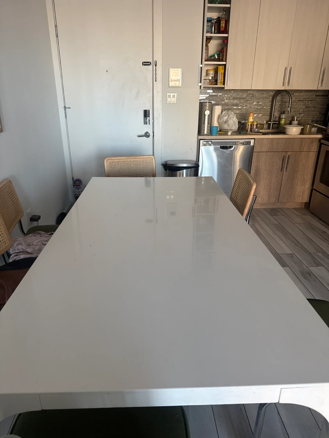 This set includes a white dining table and six chairs. The chairs have green cushions and cane backs with metal frames. It's perfect for family meals or multi purpose use of large table.