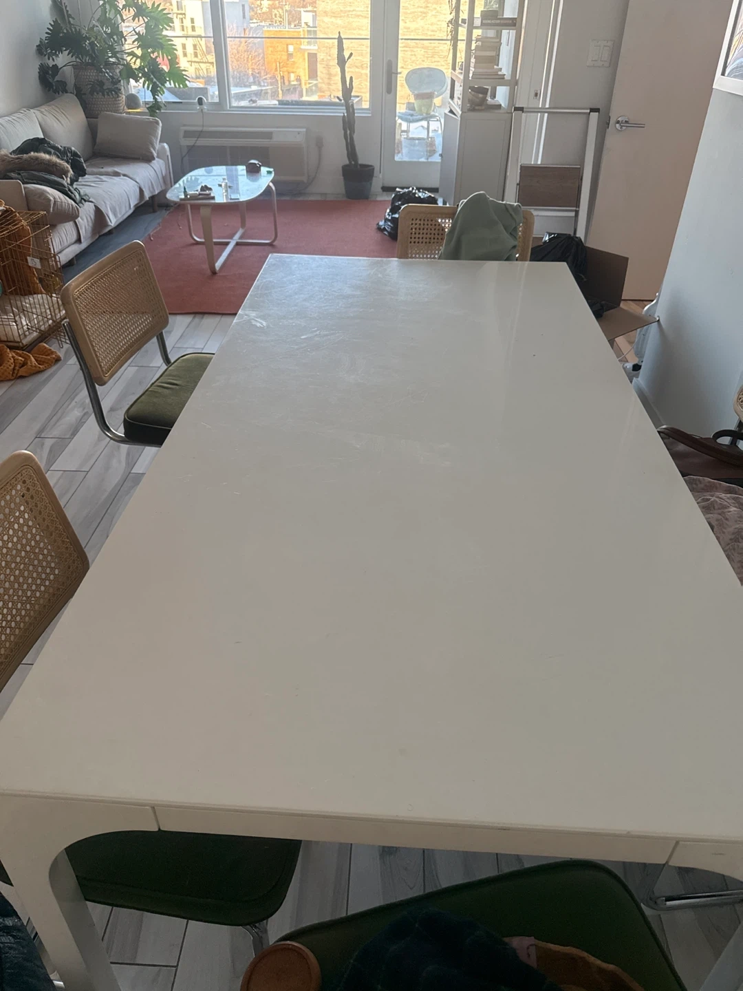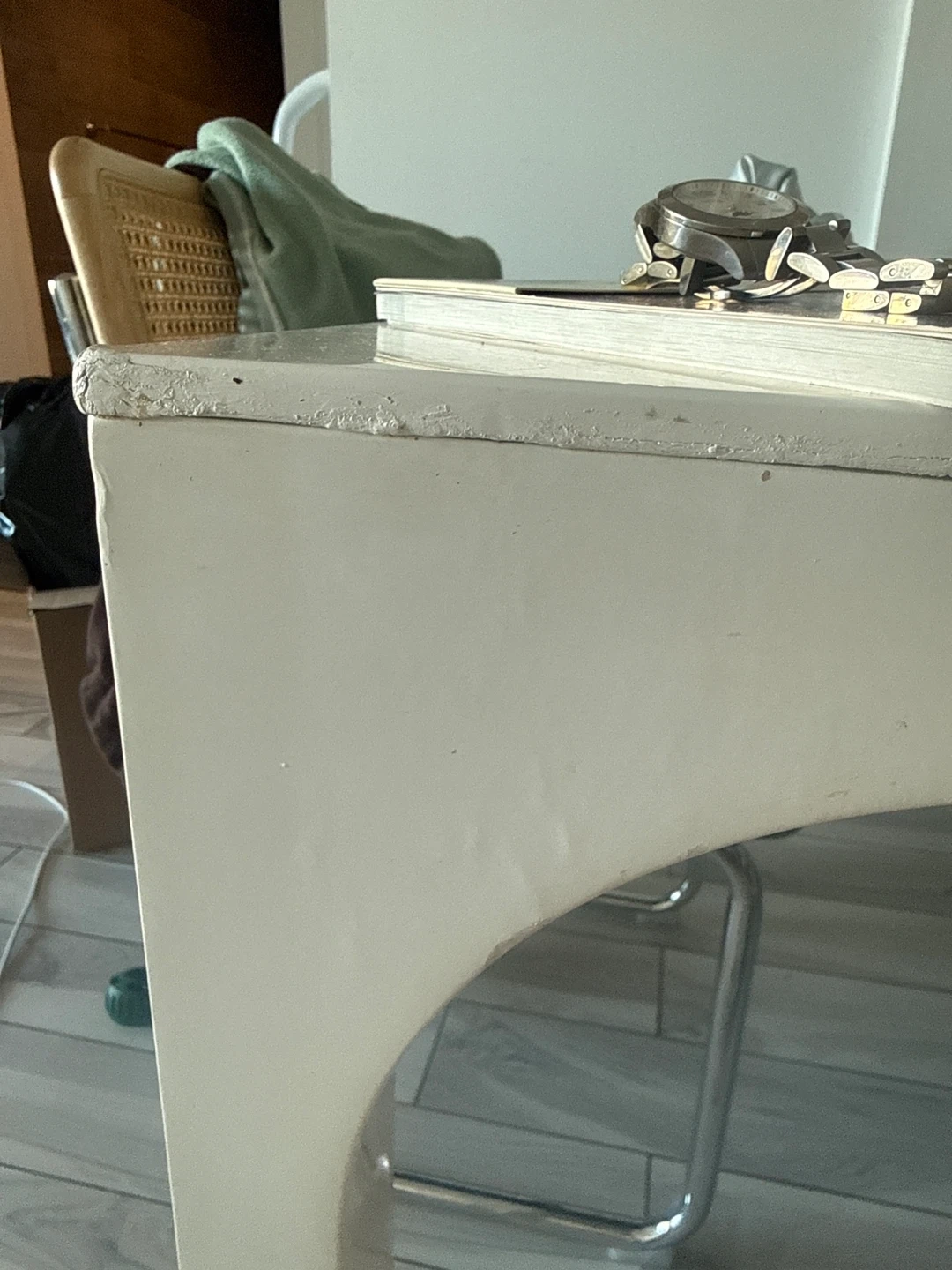 The table is an old CB2 model and has signs of wear and tear like few minor dents on top and sides , but perfectly sturdy and great table.