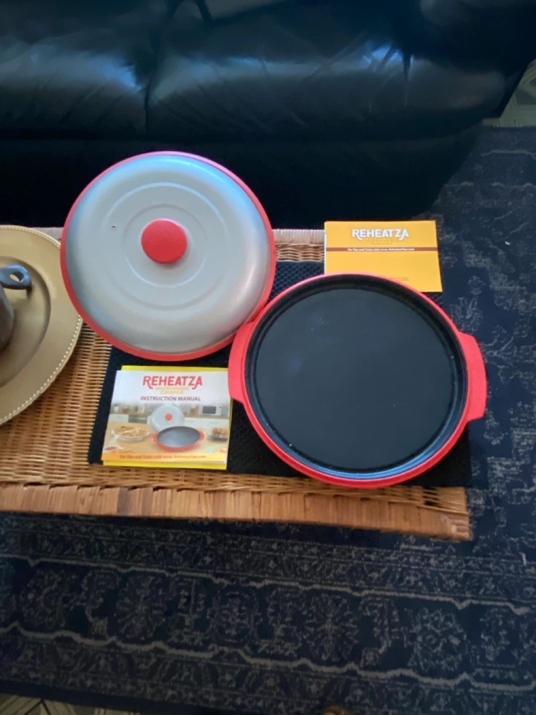 This Reheatza pan is designed for pizza and snacks. It features a non-stick surface for easy cleanup. Includes instruction manual. Makes food nice and crisp