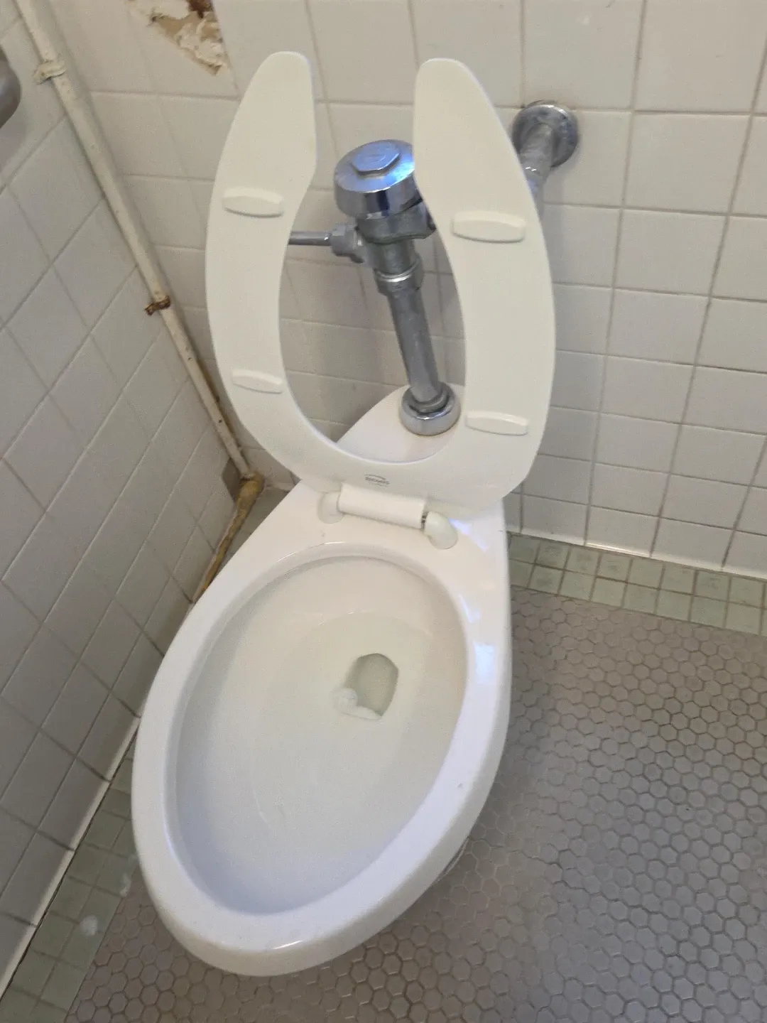 White elongated toilet bowl. It's a standard size for most bathrooms. Includes the tank lever mechanism. This is a functional toilet bowl for replacement or new installation.