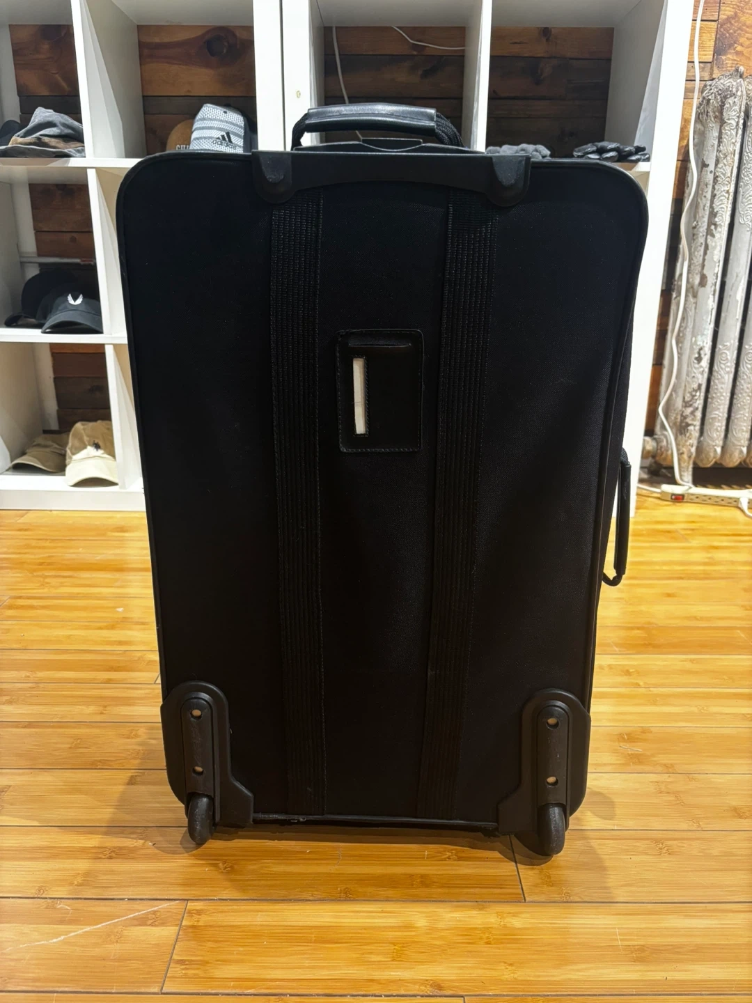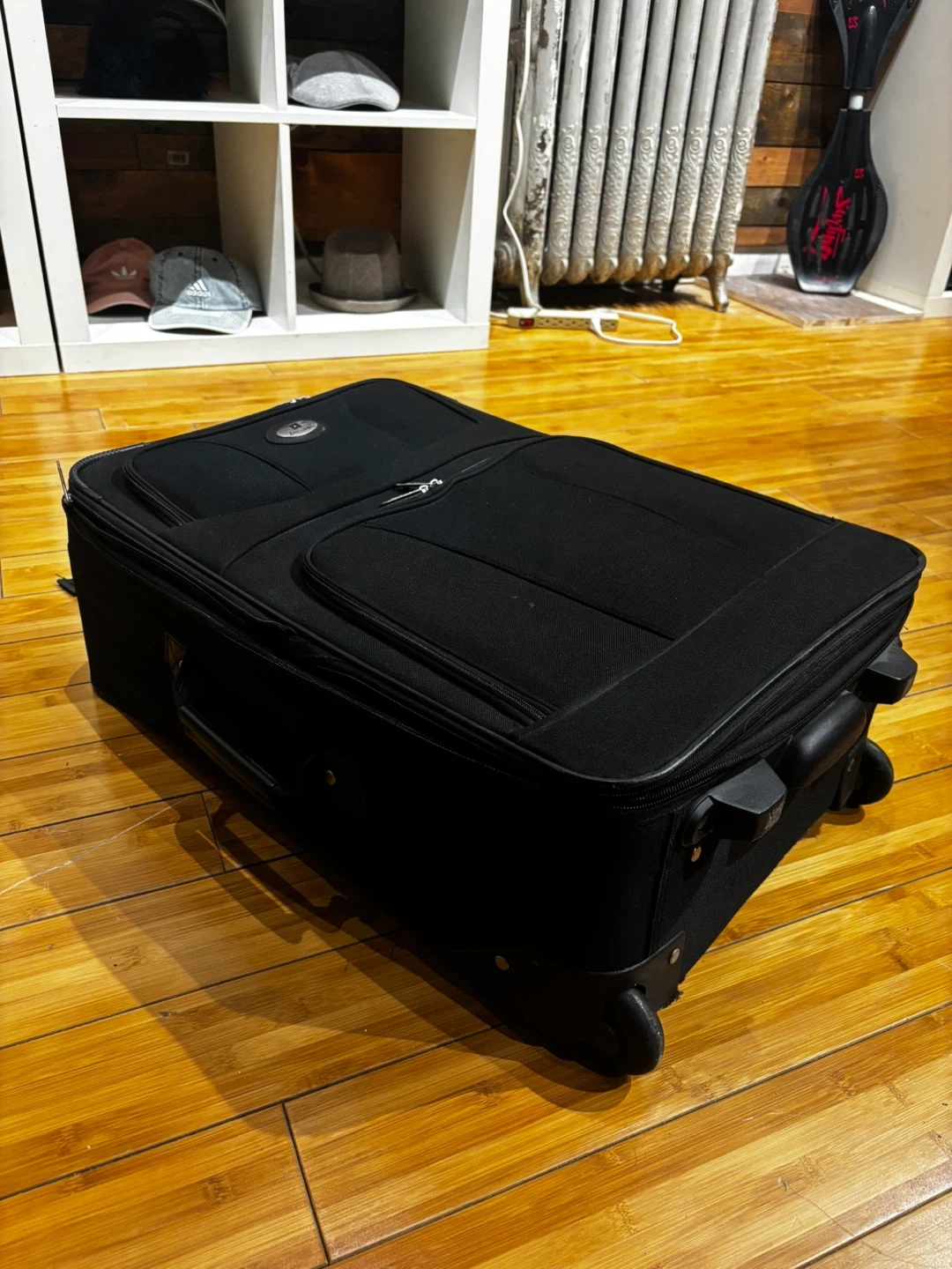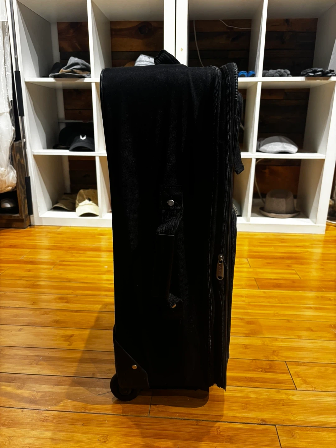 This black softside spinner suitcase is great for travel. It has a durable fabric exterior and multiple zippered compartments. The spinner wheels make it easy to maneuver through airports and busy streets! 25-15-8.5β
