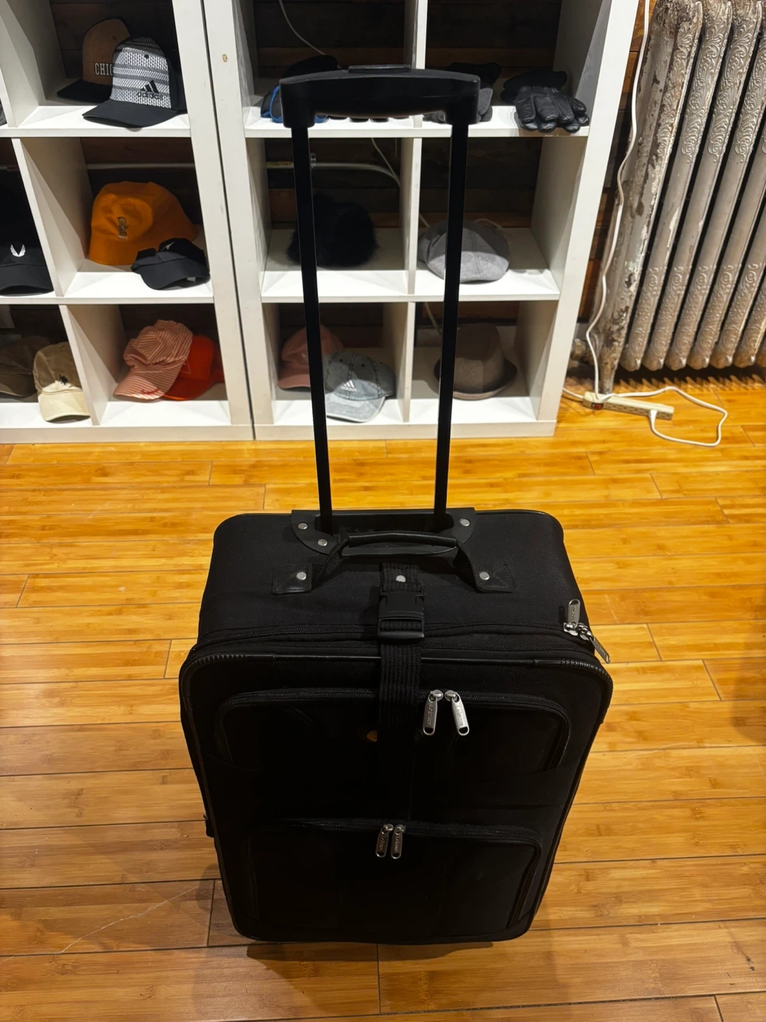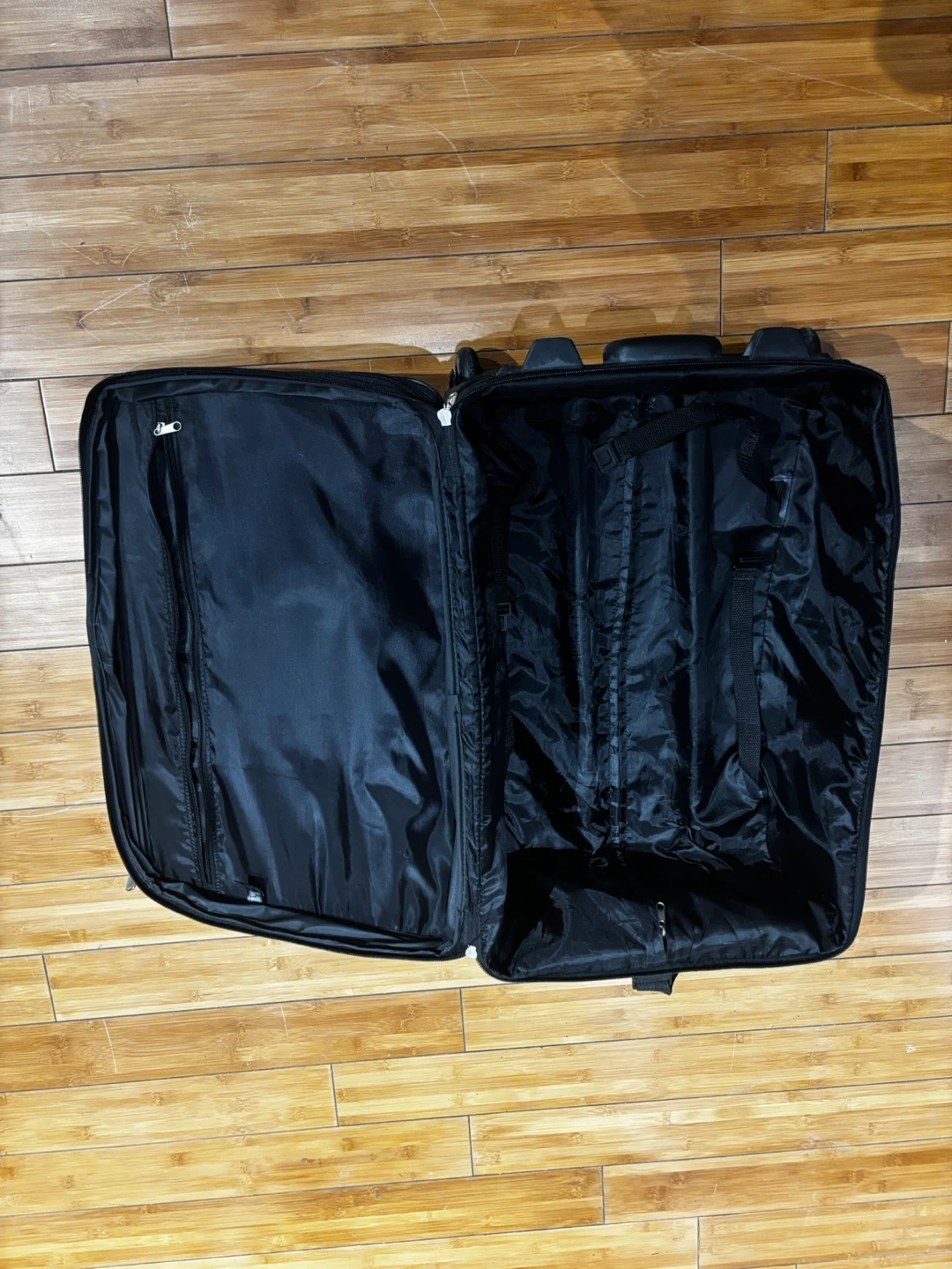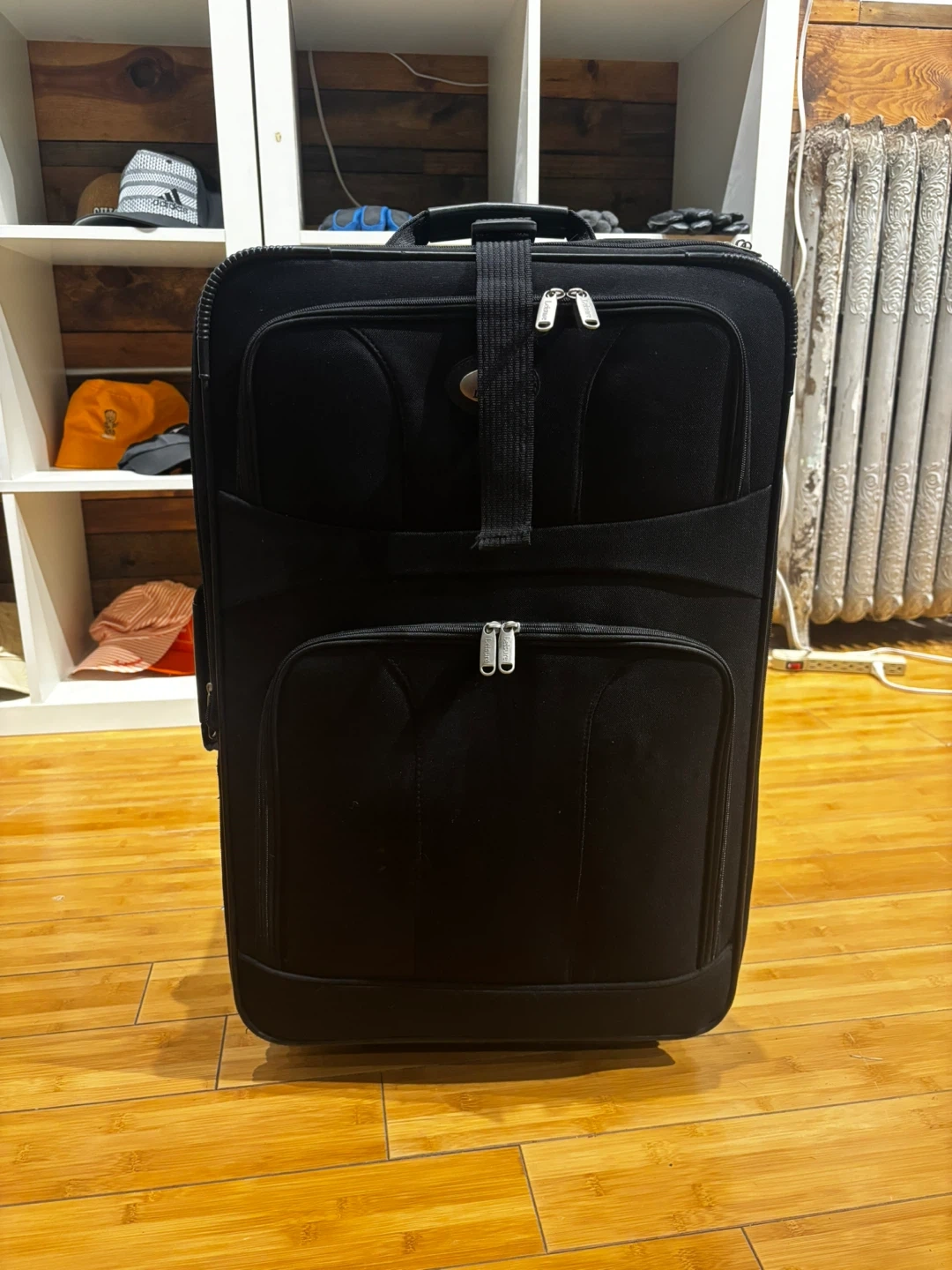 This black softside spinner suitcase is great for travel. It has a durable fabric exterior and multiple zippered compartments. The spinner wheels make it easy to maneuver through airports and busy streets! 25-15-8.5β
