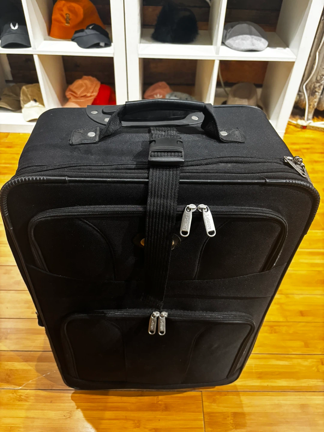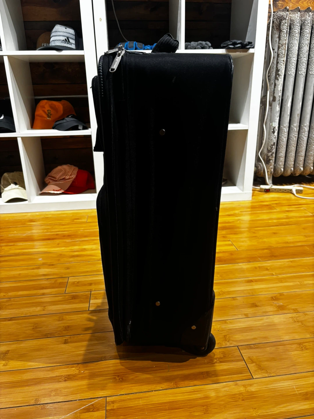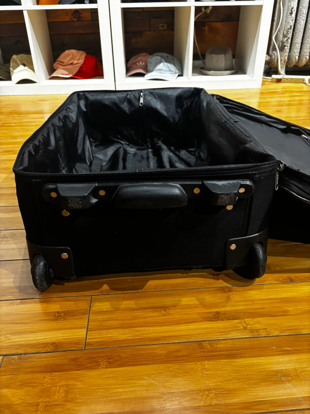 This black softside spinner suitcase is great for travel. It has a durable fabric exterior and multiple zippered compartments. The spinner wheels make it easy to maneuver through airports and busy streets! 25-15-8.5β