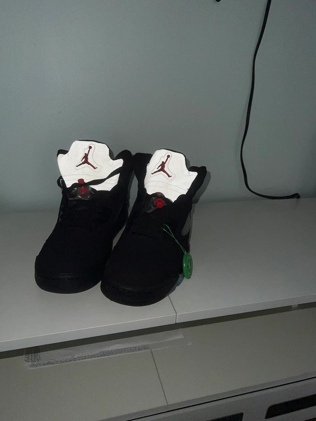 Air Jordan 5 Retro sneakers in a "Black Metallic" colorway. Features a suede black upper with grey and red accents. These shoes come with an "Authentic" verification tag attached.
