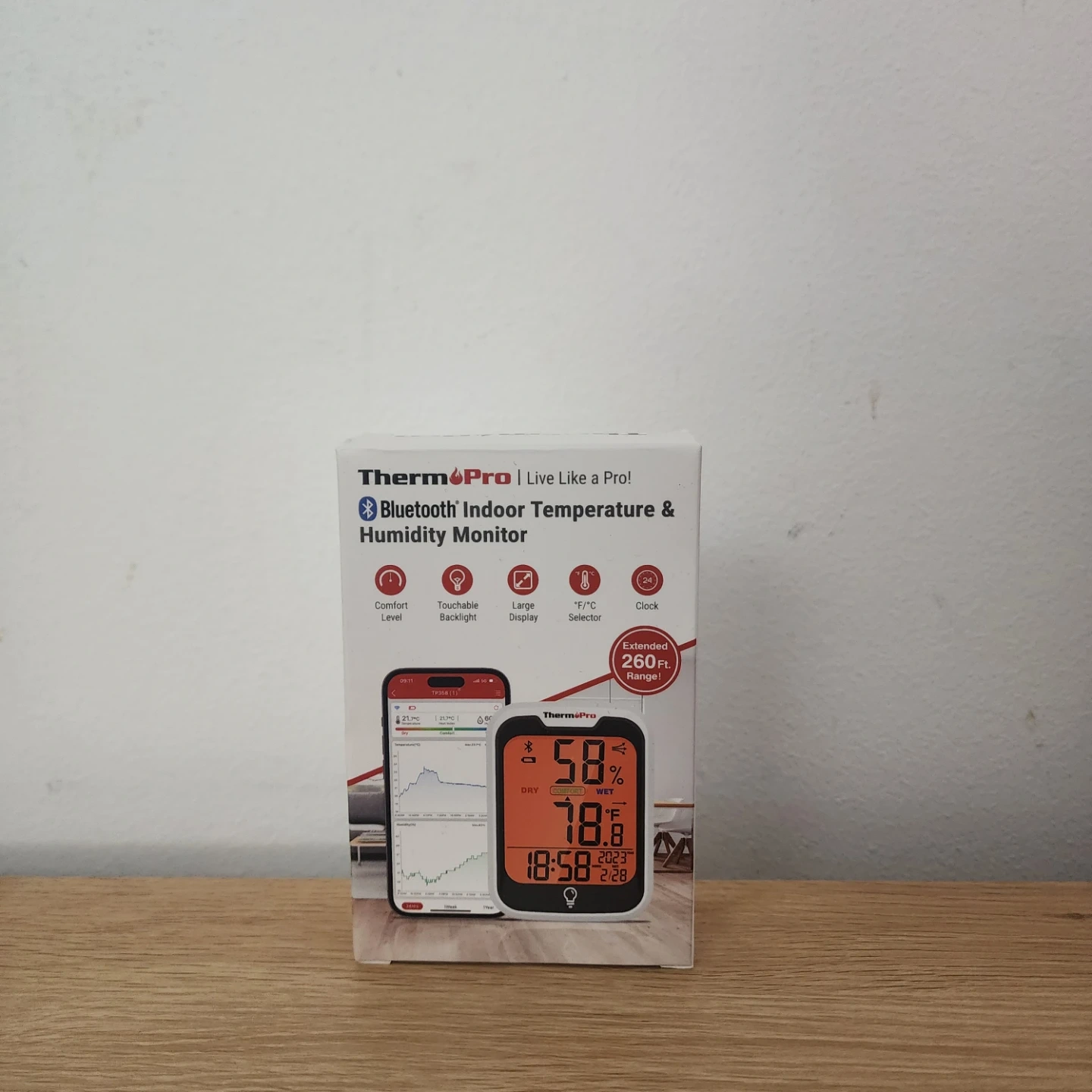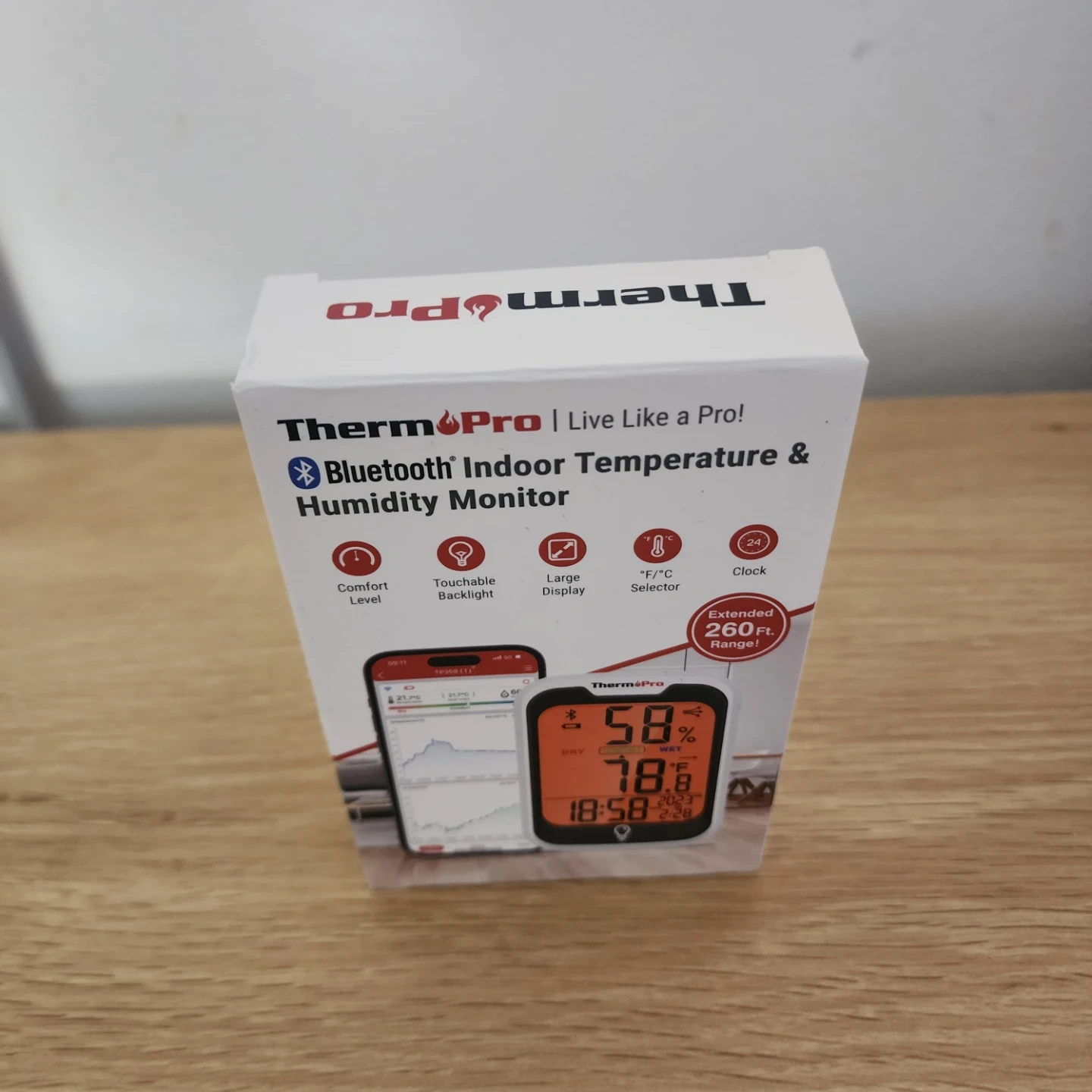 This ThermoPro Bluetooth indoor temperature and humidity monitor tracks your environment. It offers a large, touchable display and extended 260ft range. Includes the hygromenter, 2 AAA batteries, and user manual.