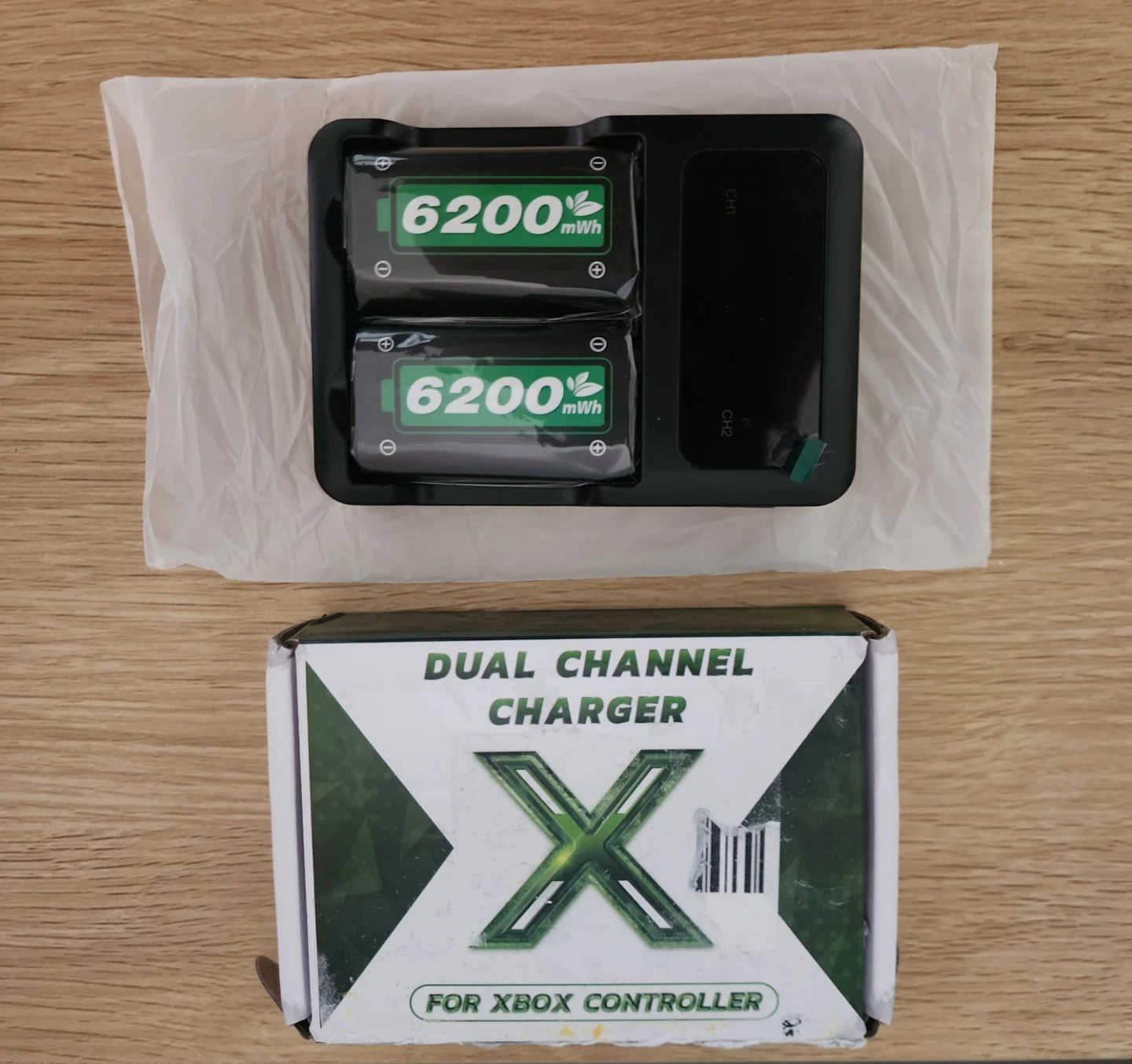 Dual channel charger for Xbox controllers. Includes two 6200mAh rechargeable batteries. Features overcurrent, short circuit, over-temperature, and over-voltage protection. Input: DC 5V/2V. Output: DC 3.0V 500mA x2.