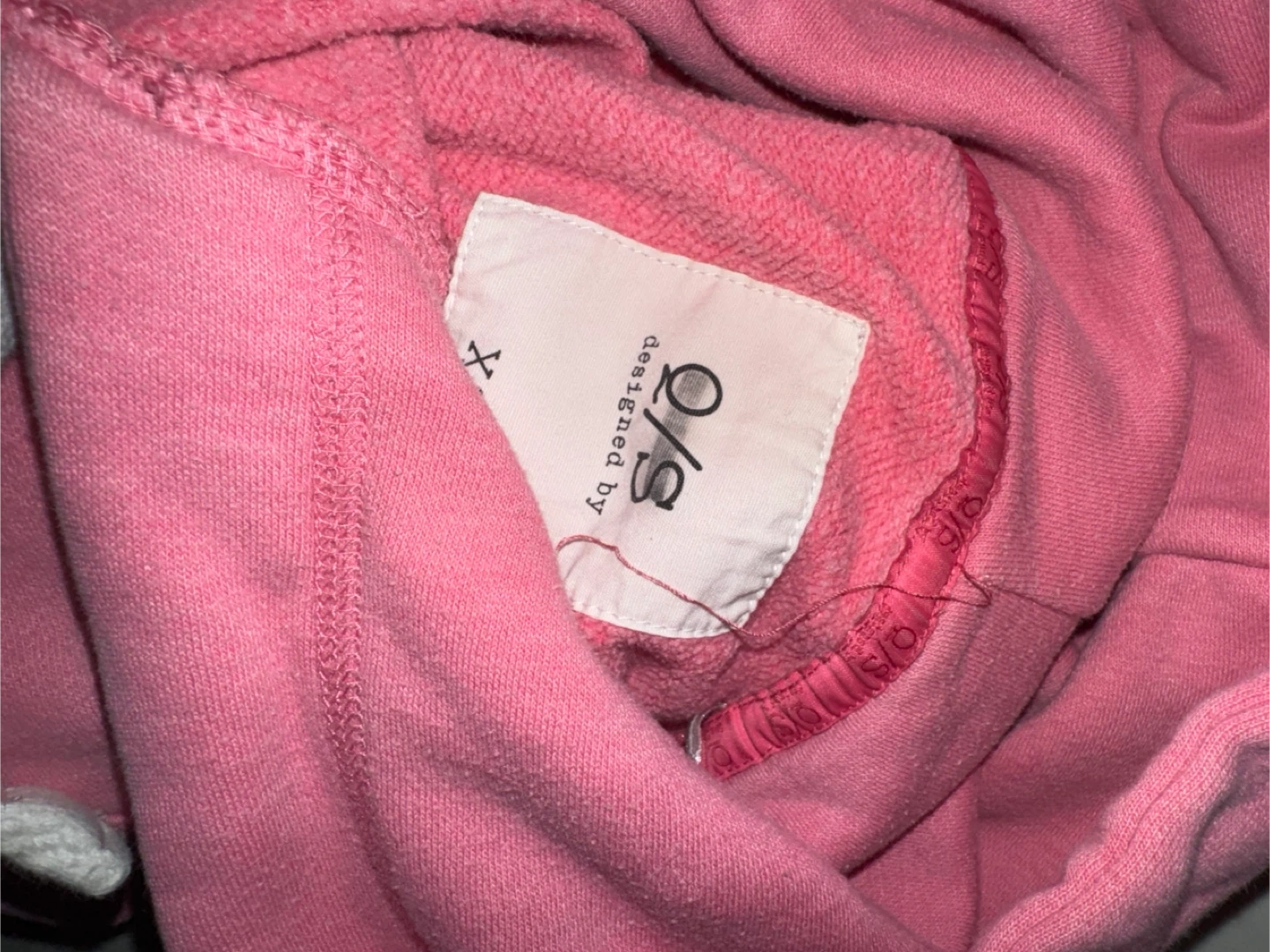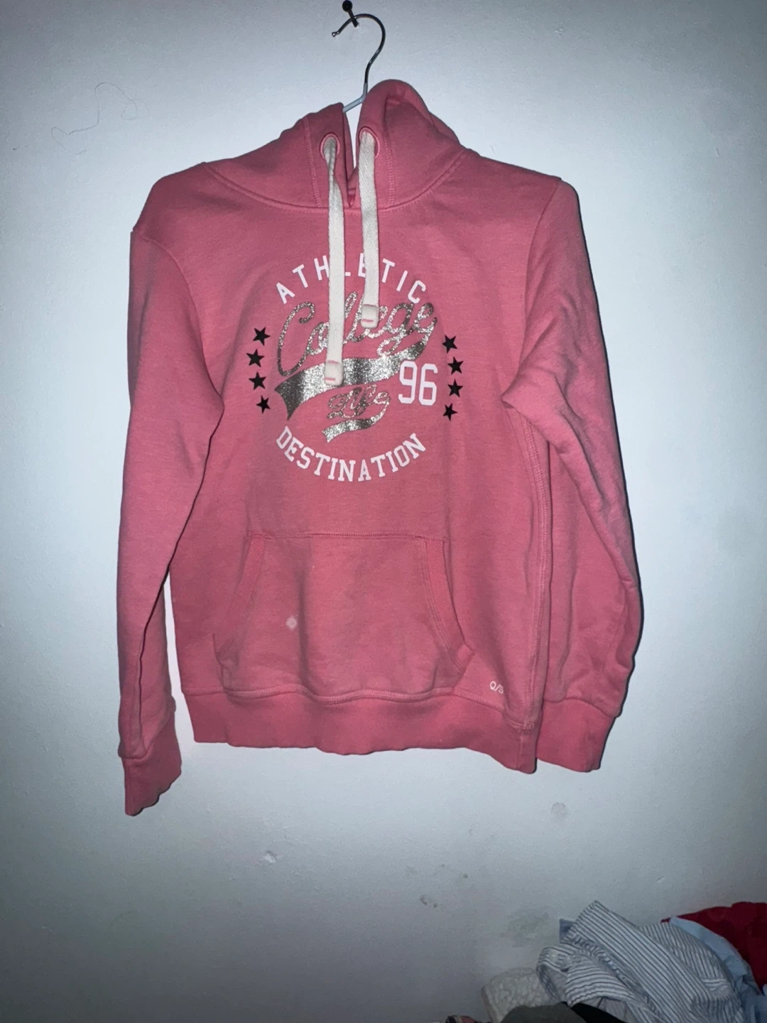 This pink hoodie has "Athletic Destination 96" printed on the front. It's made of a soft cotton blend. The brand tag inside says "O/S designed by".