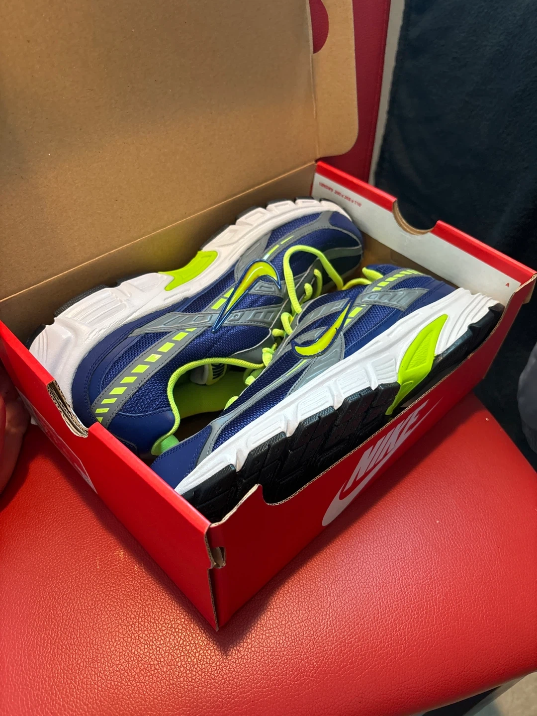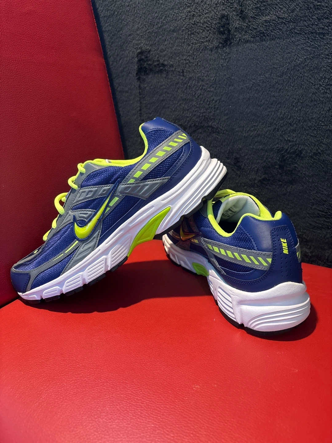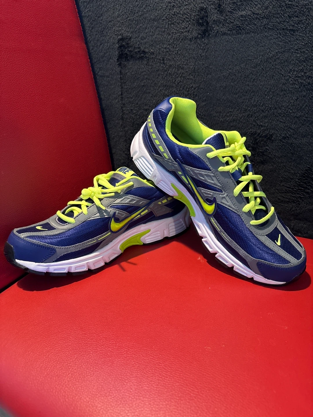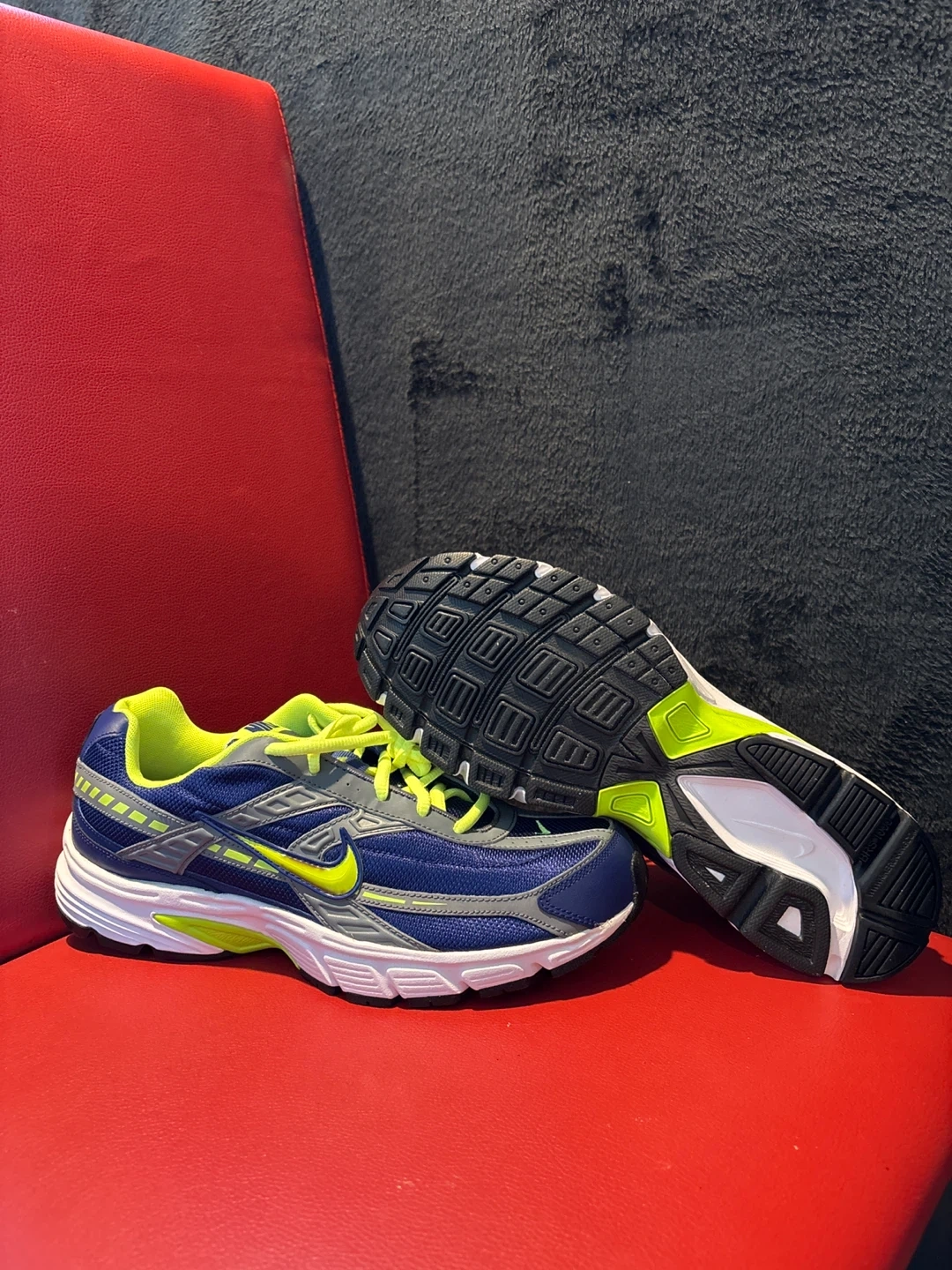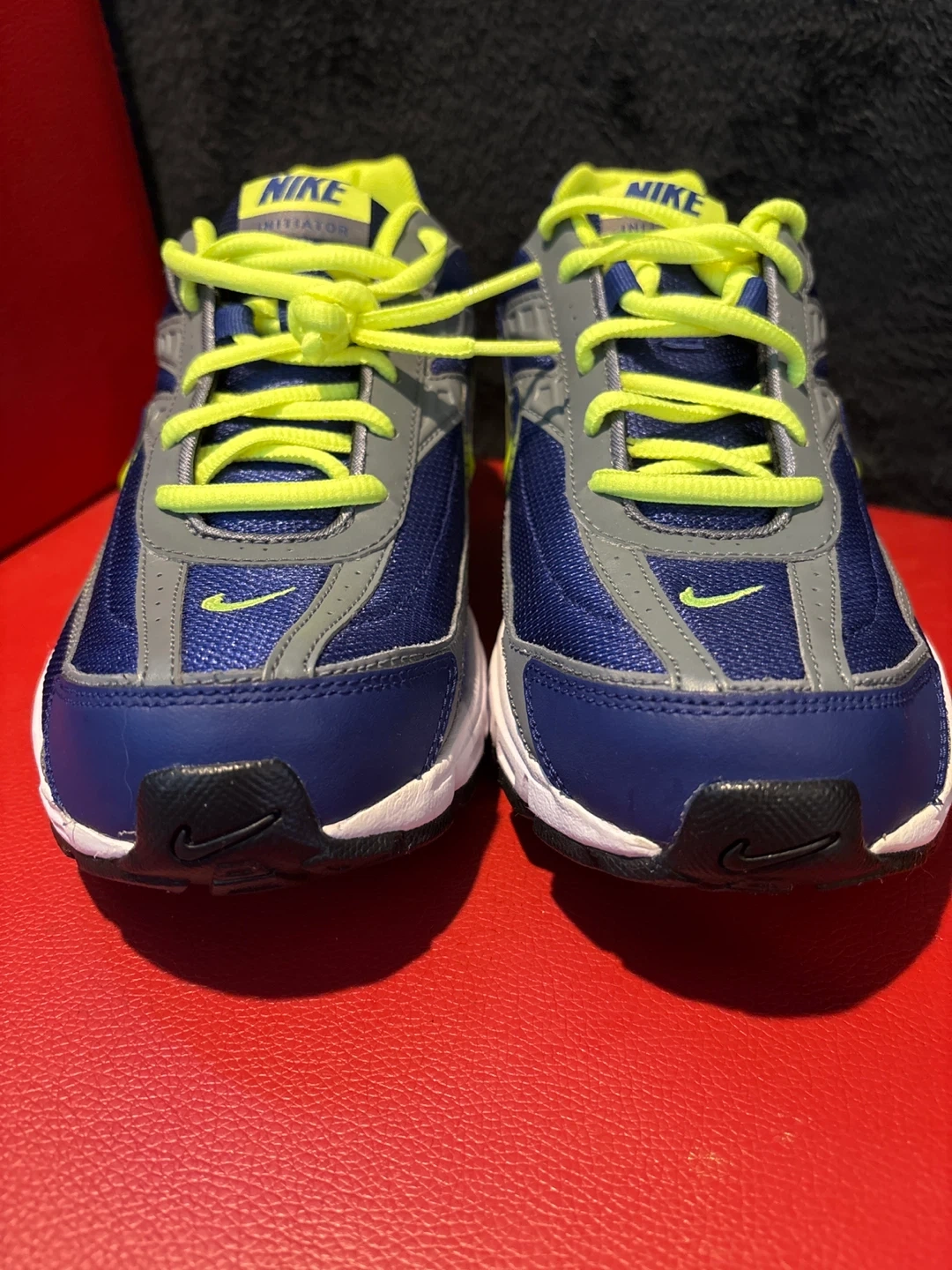 These are Nike Initiator running shoes in a blue, grey, and lime colorway. They feature a durable rubber outsole and a breathable mesh upper. Brand new