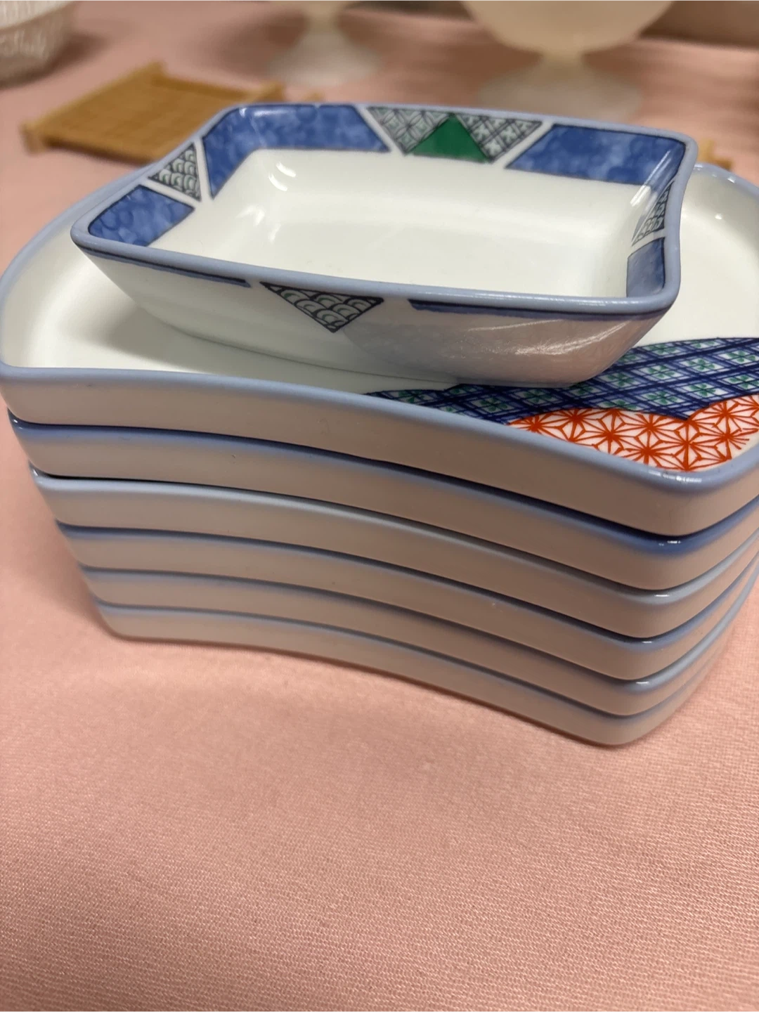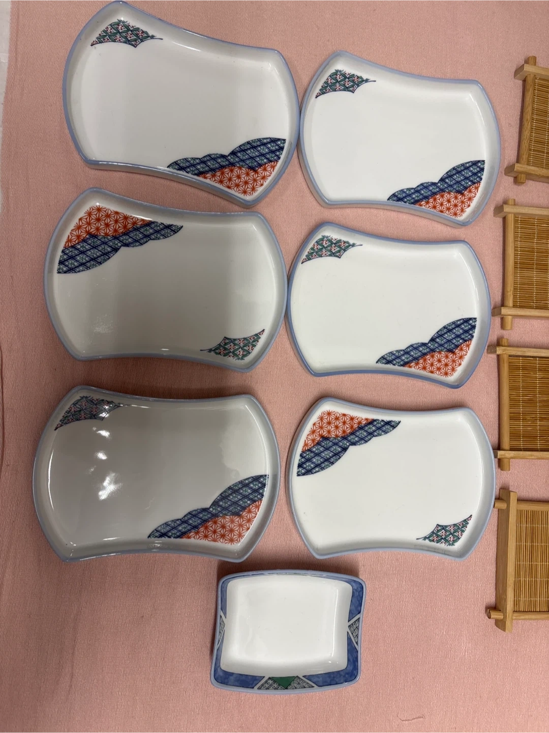 This is a set of 7 rectangular plates by Noritake JAL. They feature a blue, red, and green Japanese-inspired pattern. One smaller rectangular dish is included. This set is great for serving appetizers or condiments.