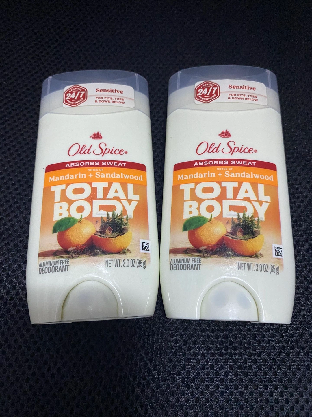 Old Spice Total Body Aluminum Free Deodorant. Absorbs Sweat. Mandarin + Sandalwood scent. 3.0 oz. $6 each.