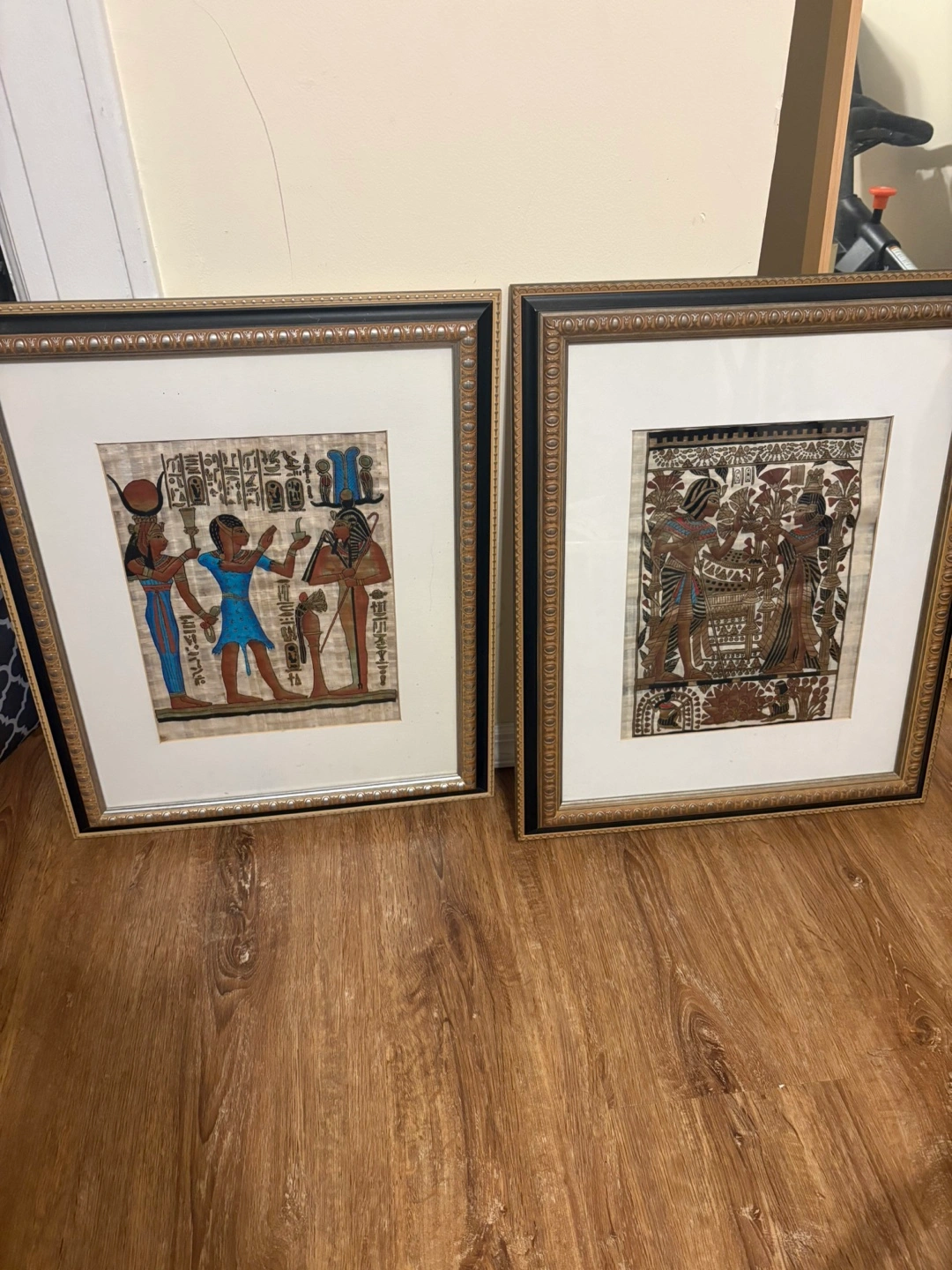 Two framed papyrus art pieces depicting Egyptian scenes. Both pieces are framed with gold and black accents. They feature intricate details and vibrant colors.