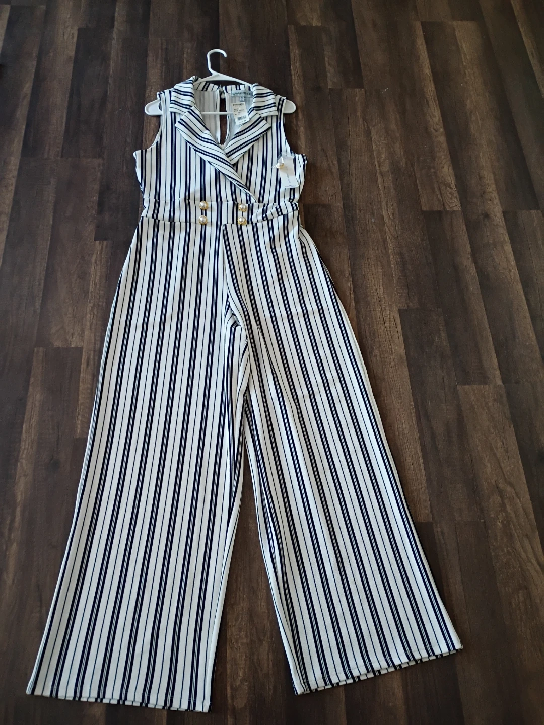 This is an Almost Famous jumpsuit with a stylish striped pattern! It features a collared neckline and gold button details. Perfect for a chic and comfortable look