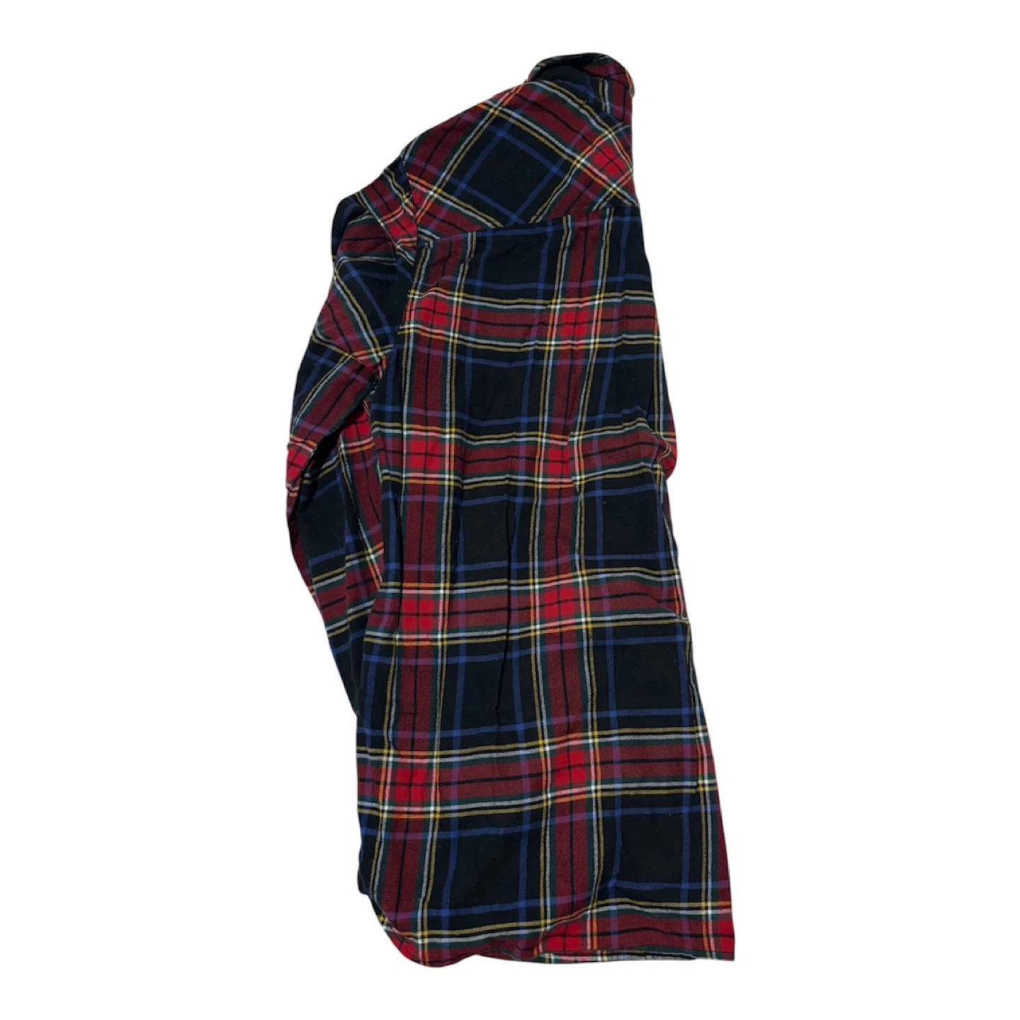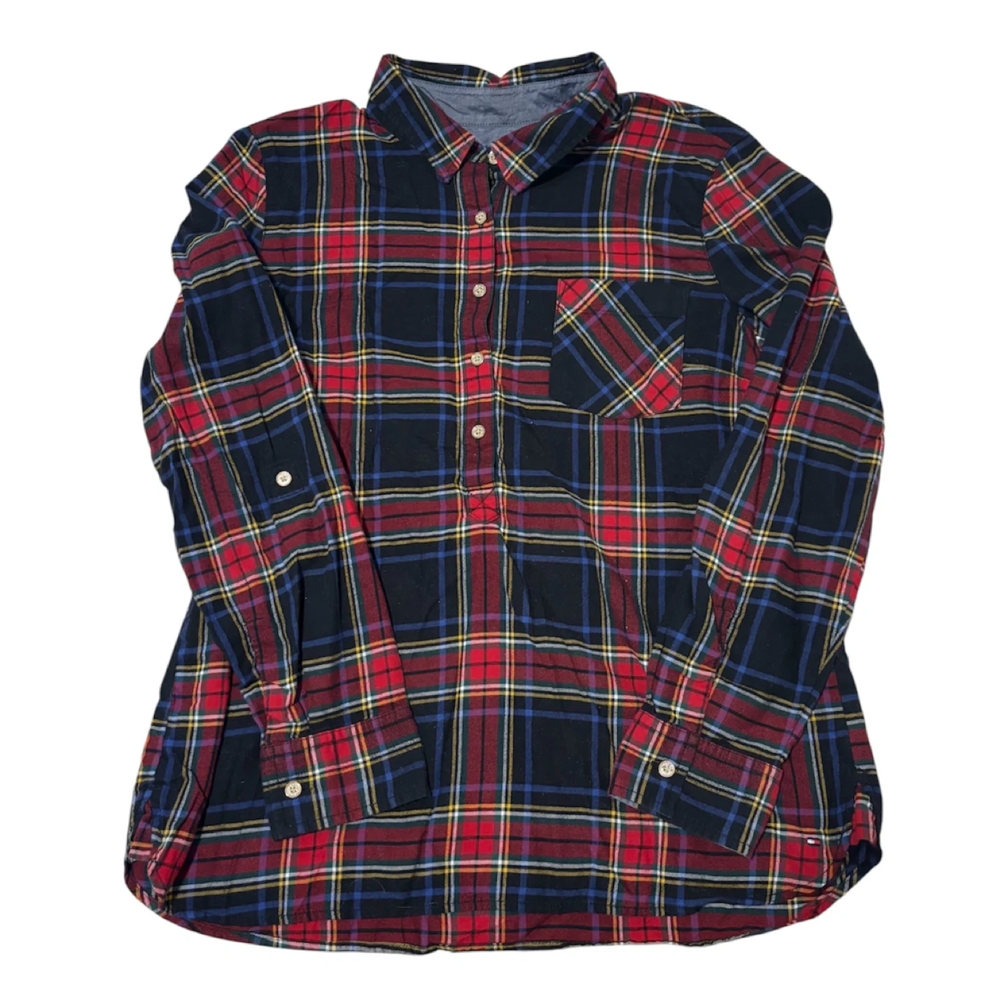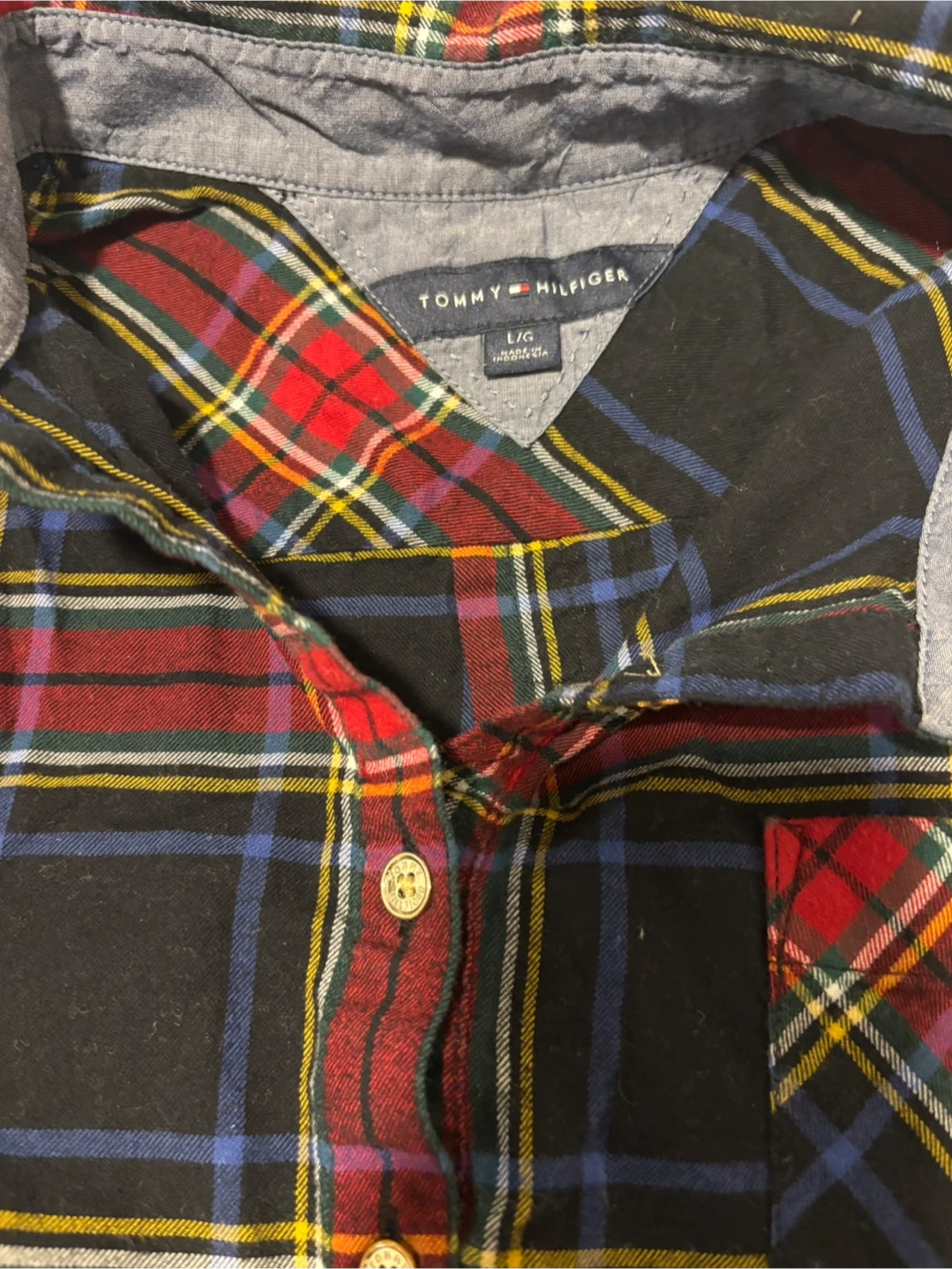 Tommy Hilfiger long-sleeve flannel shirt in a red, black, blue, and yellow plaid pattern. It's a size Large. Features a button-down front and a chest pocket.