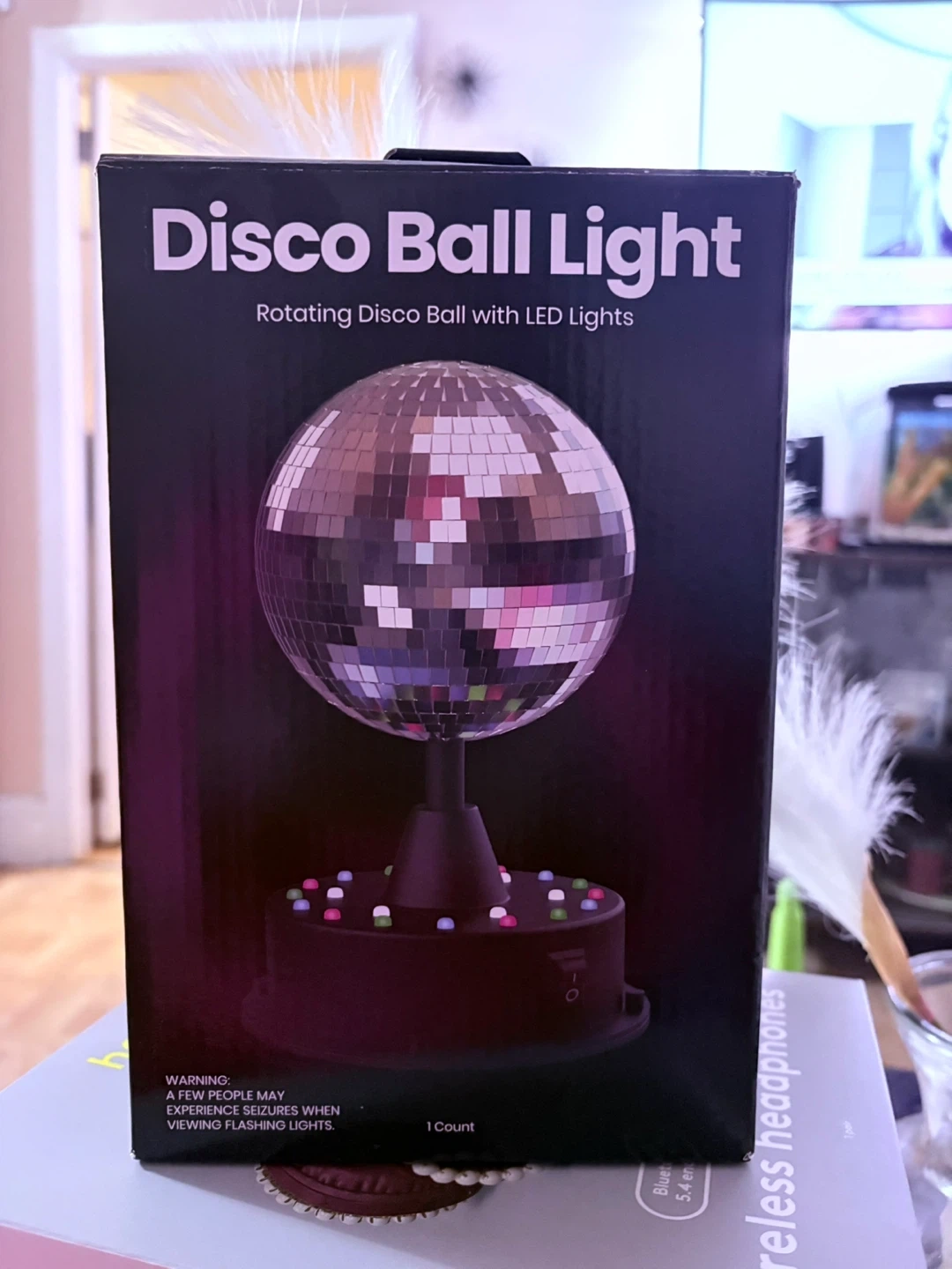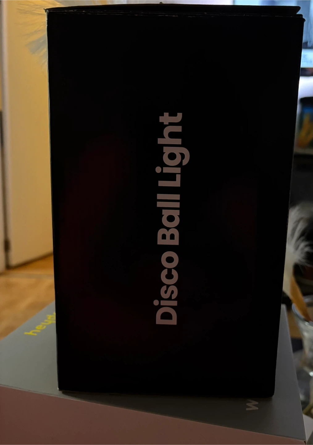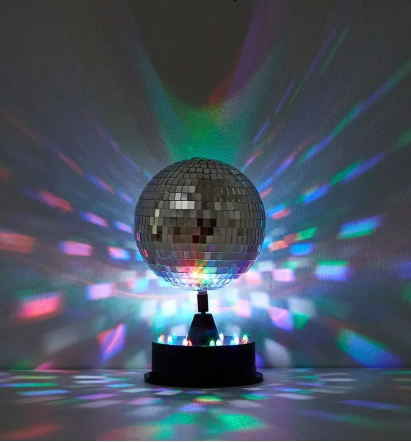 Rotating disco ball with 18 colorful LED lights for a vibrant light show. Sturdy base with pre-drilled holes for easy wall or ceiling mounting. Powered by included cable or 3x AA batteries (not included). Includes 1 Disco Ball Light and 1 USB-A to DC Cable.