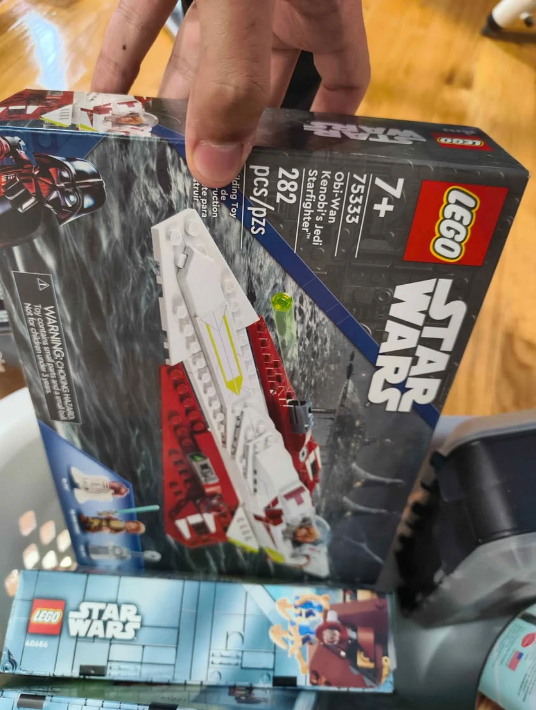 This is the LEGO Star Wars Obi-Wan Kenobi's Jedi Starfighter set, number 75333. It has 282 pieces. Includes Obi-Wan Kenobi, Taun We, and R2-D2 minifigures. The set is for ages 7+.