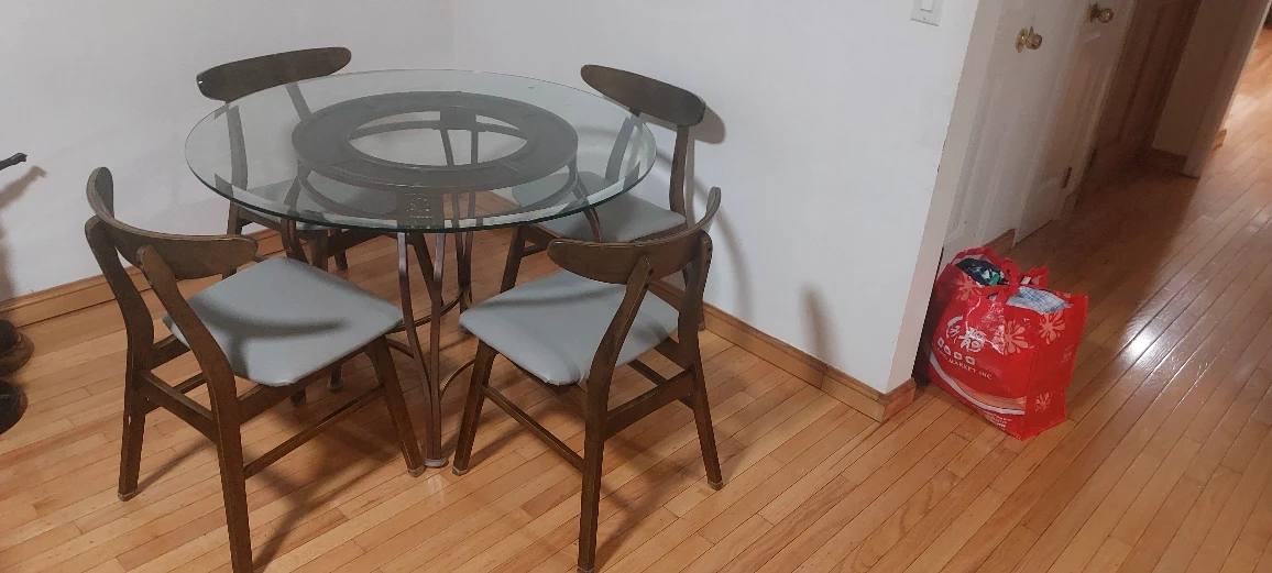 Round glass top dining table with four upholstered chairs. The table features a unique decorative metal ring at its base. Chairs have wooden frames and light gray seats. This set's perfect for a cozy dining nook!