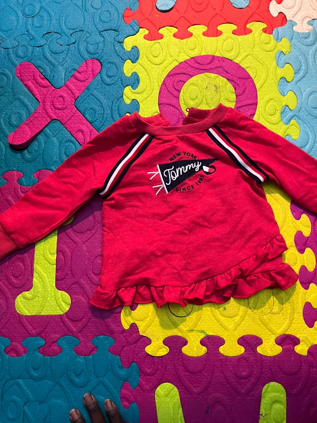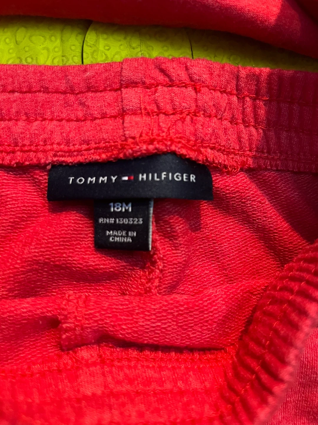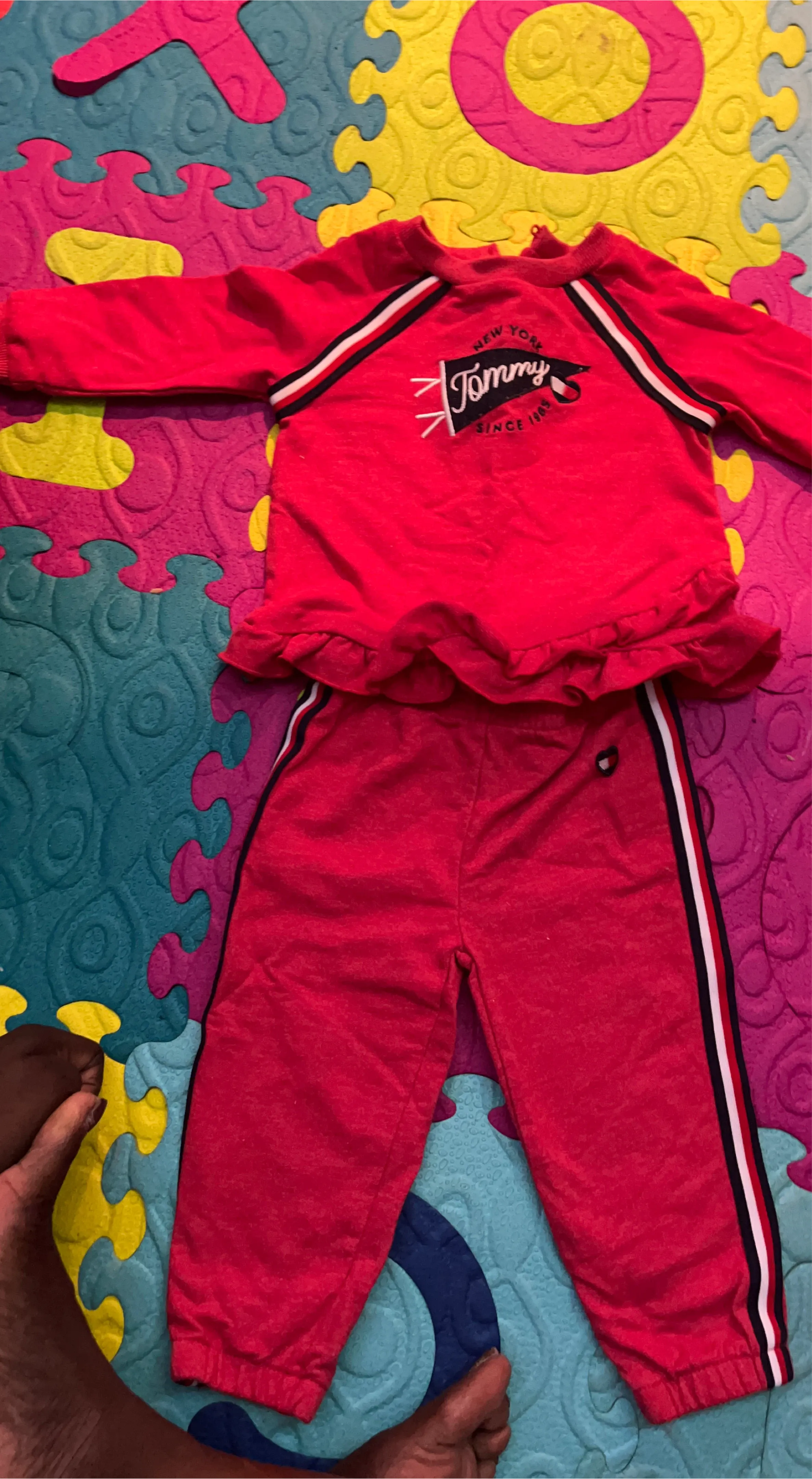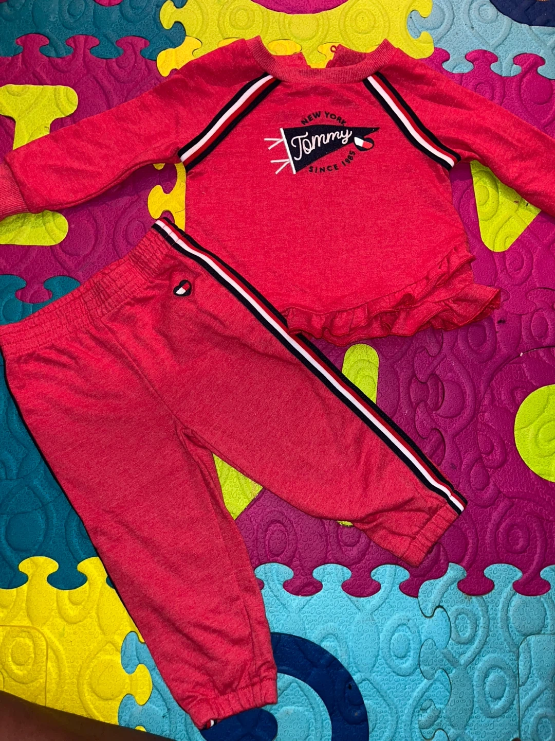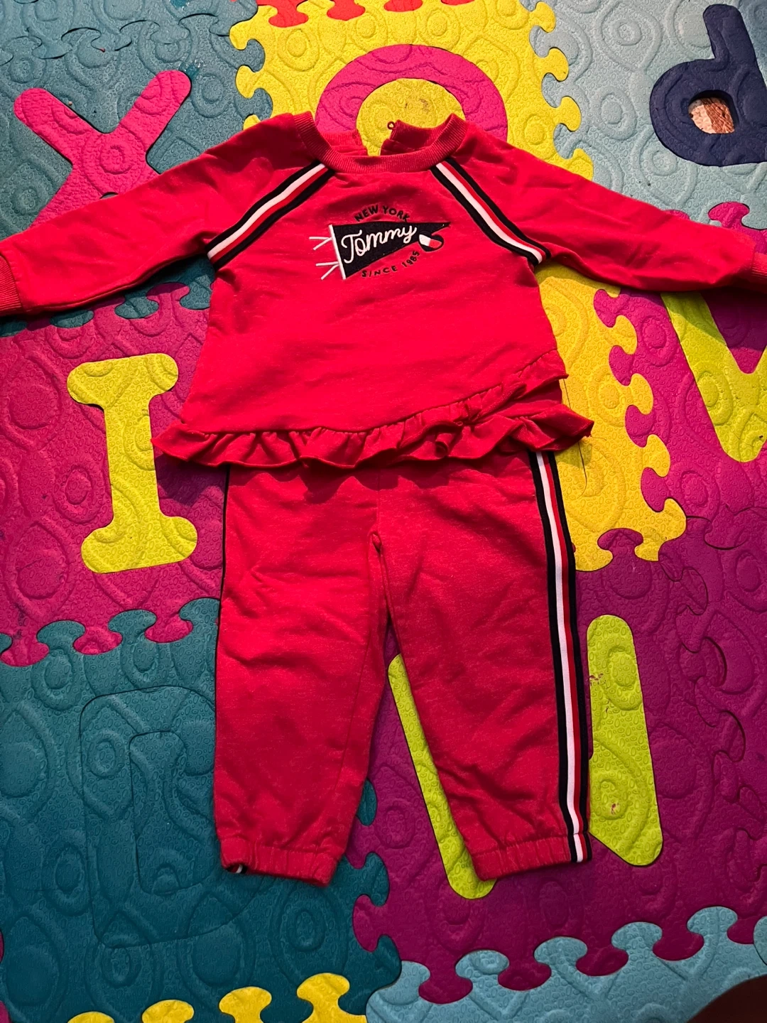 This is a red Tommy Hilfiger sweatshirt and jogger set for baby girls. The top features a ruffle detail and the pants have stripe accents on the sides. Set includes top and pants. Size 18 months. In ver good condition.