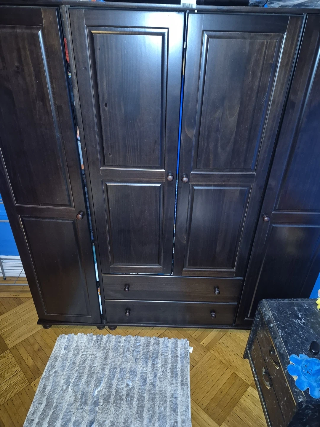 This is a dark wood wardrobe with multiple doors and drawers. It offers ample storage space for your clothing and belongings. The rich wood finish complements various bedroom decor styles.