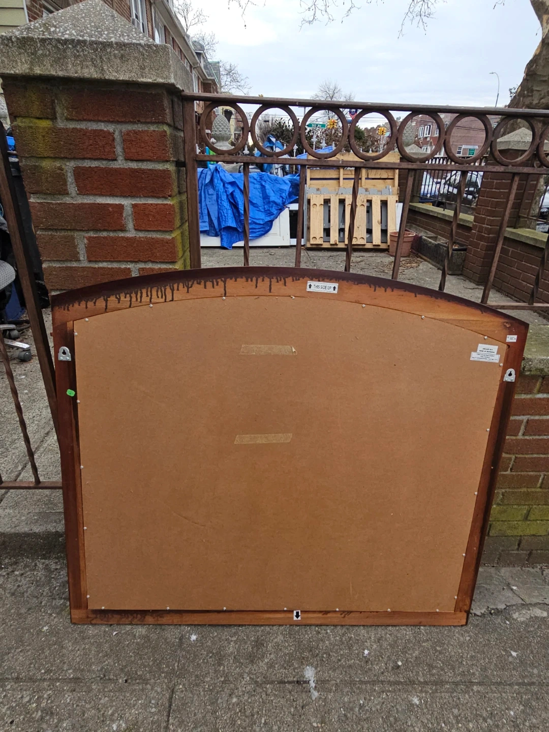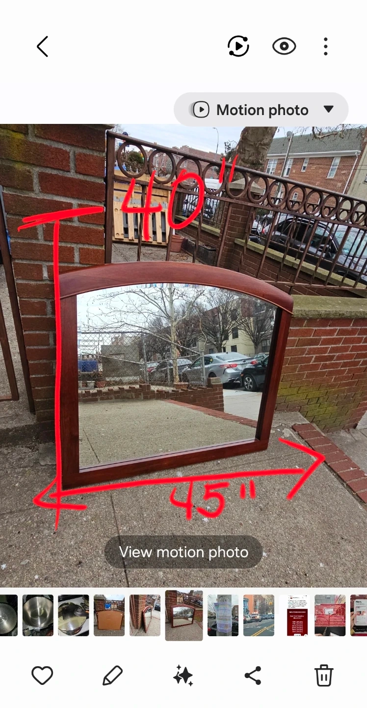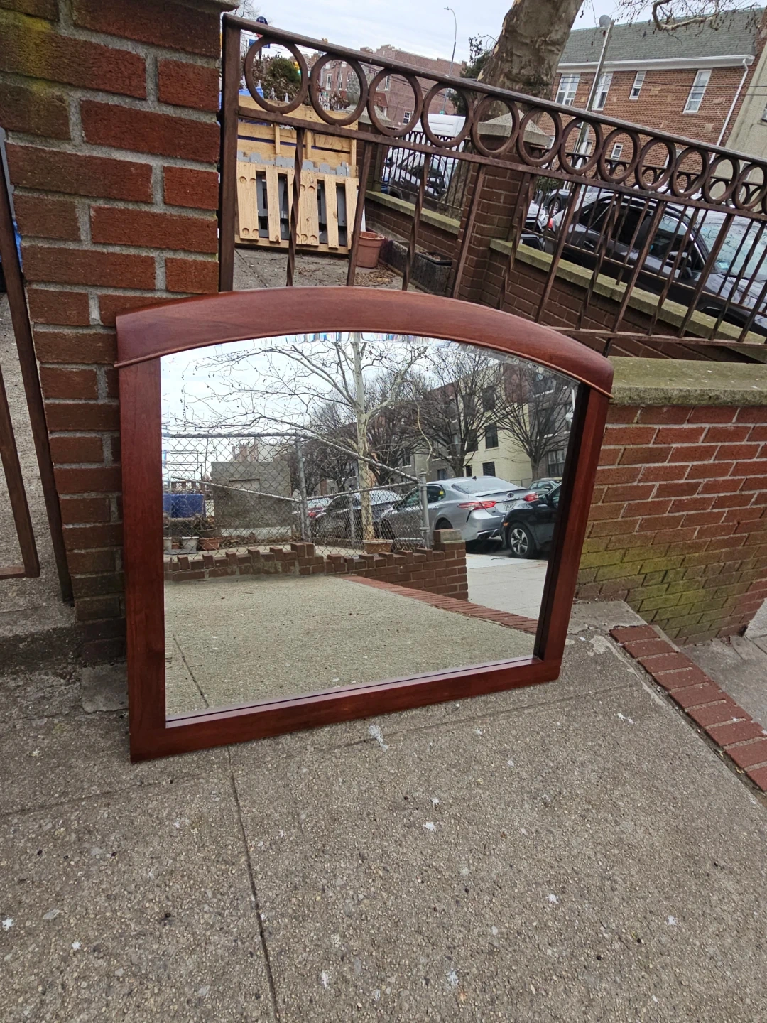 This wooden framed beveled mirror features an elegant arch top. It measures 45 inches wide and 40 inches tall. The rich wooden frame complements many decor styles.