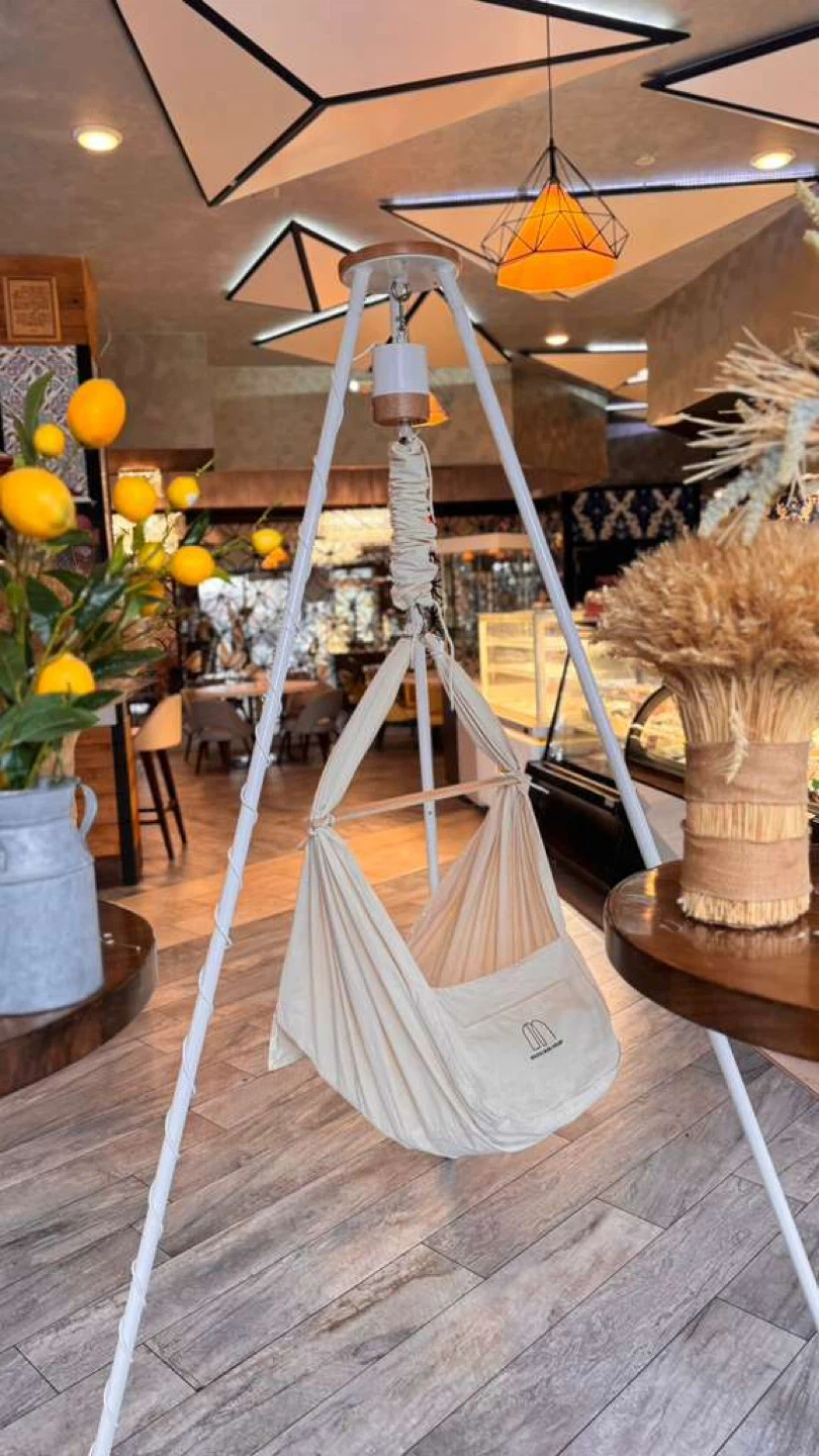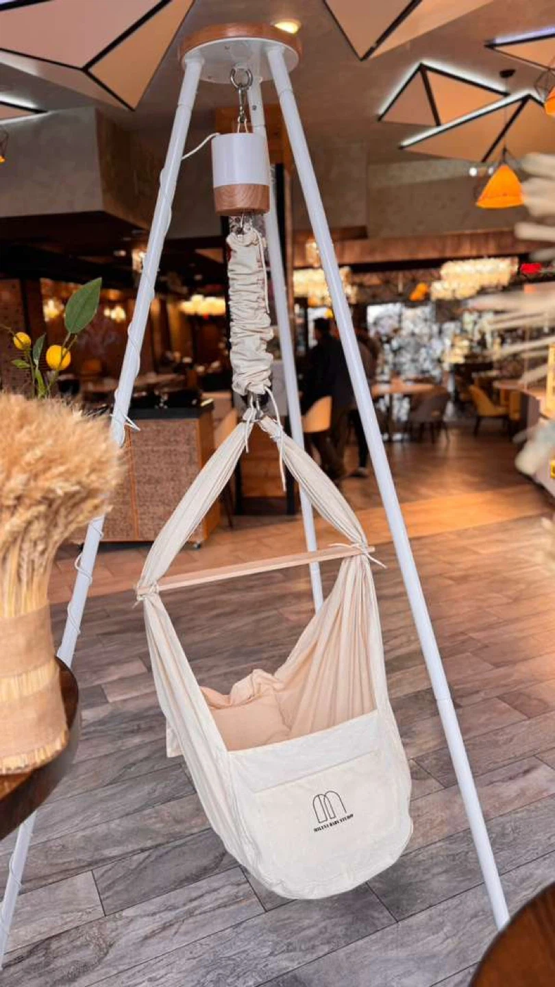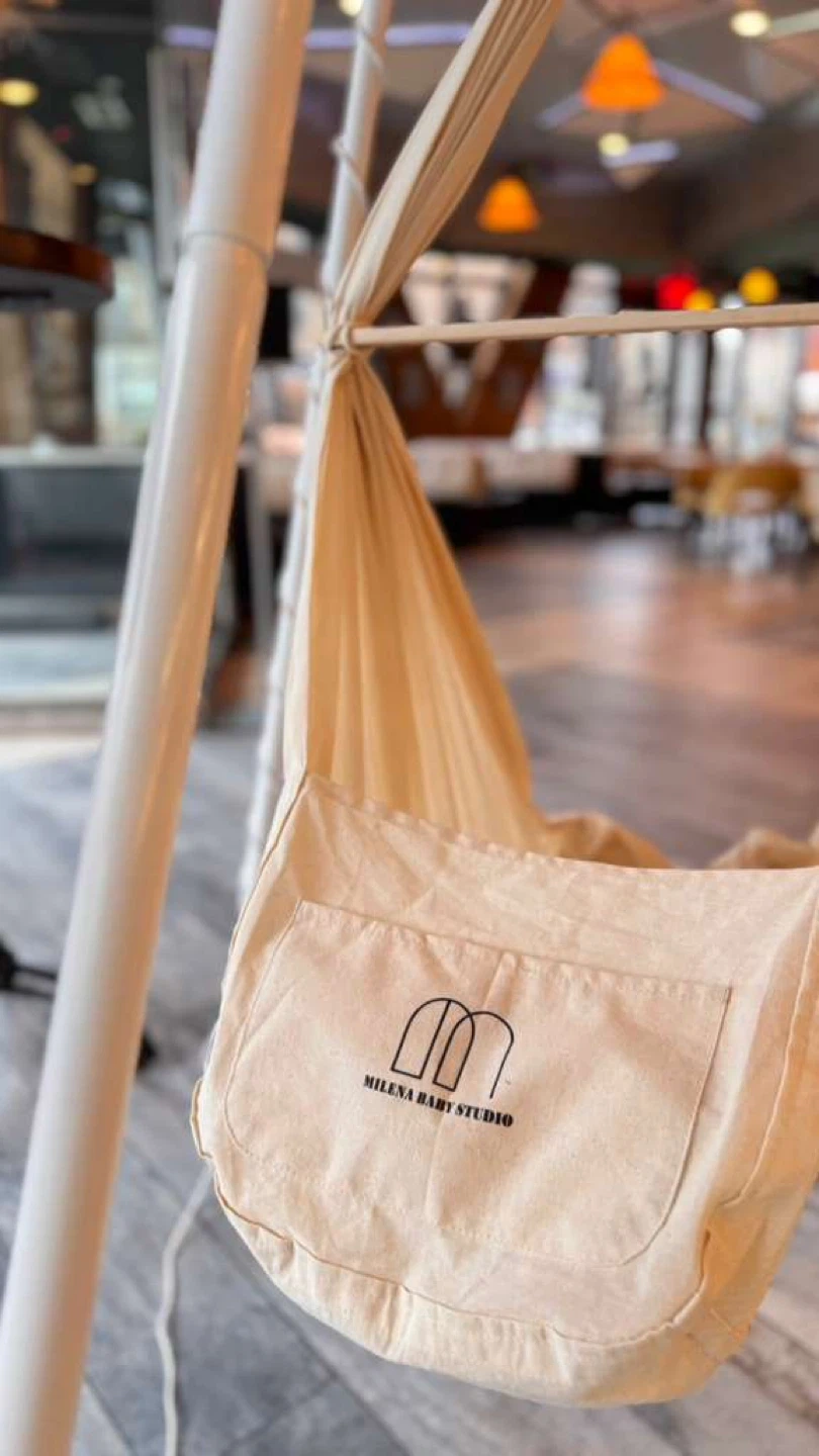 This baby hammock from Milena Baby Studio comes with a stand. It's a cozy spot for your little one. The hammock is made of a soft, cream-colored fabric.