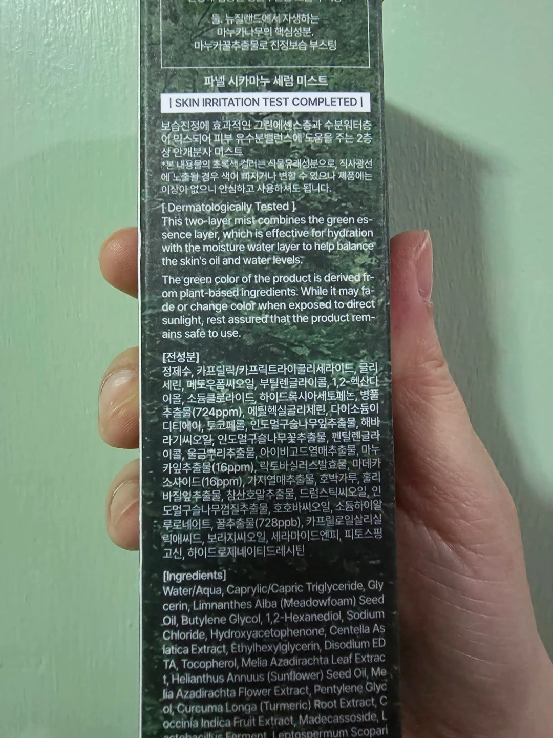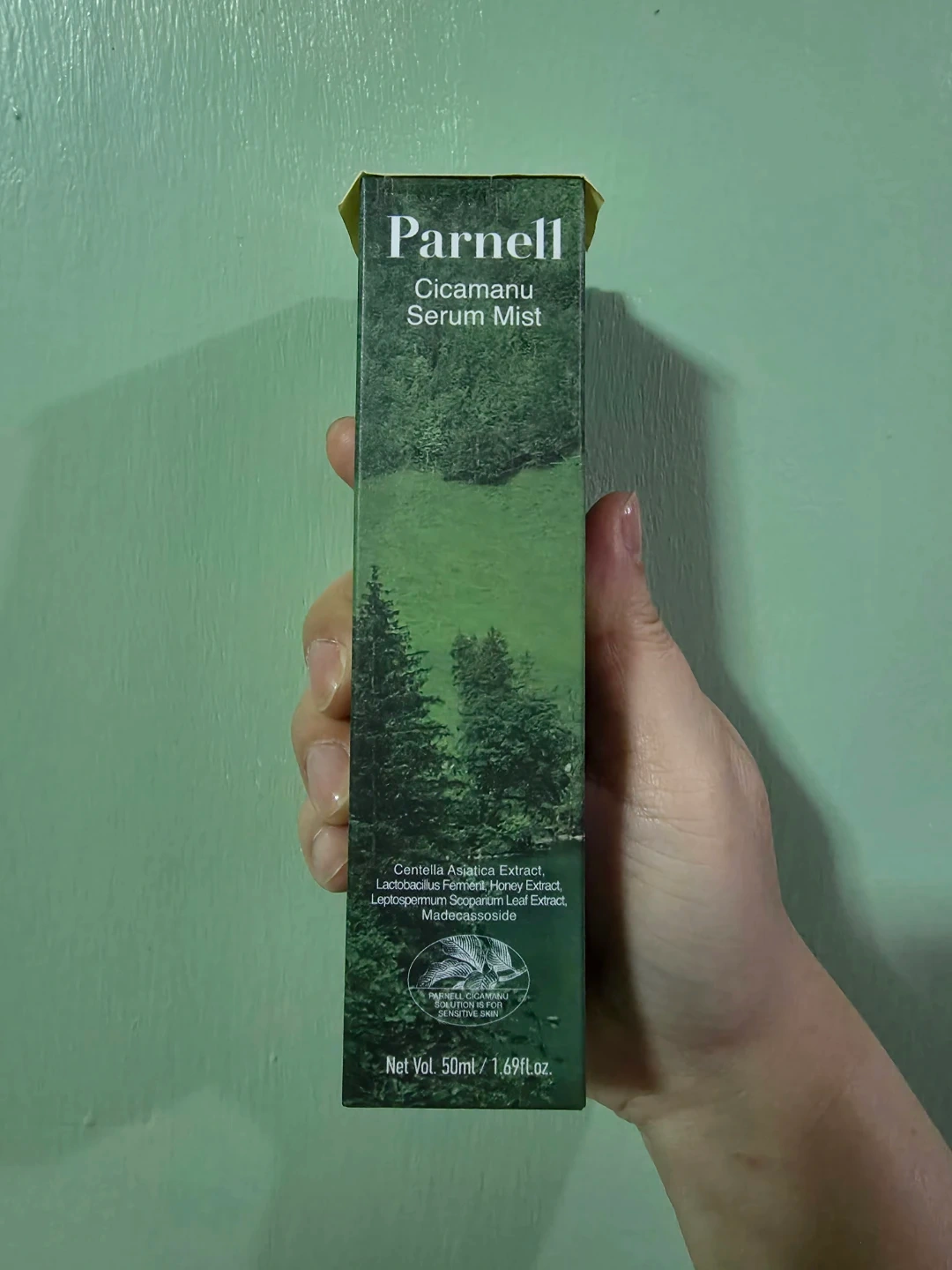 NEW Parnell Cicamanu Serum Mist! It's a two-layer green essence spray designed for hydration, balancing the skin's oil and water levels. It contains Centella Asiatica Extract and other beneficial ingredients. Net Vol. 50ml / 1.69fl.oz. Expires March 2028.