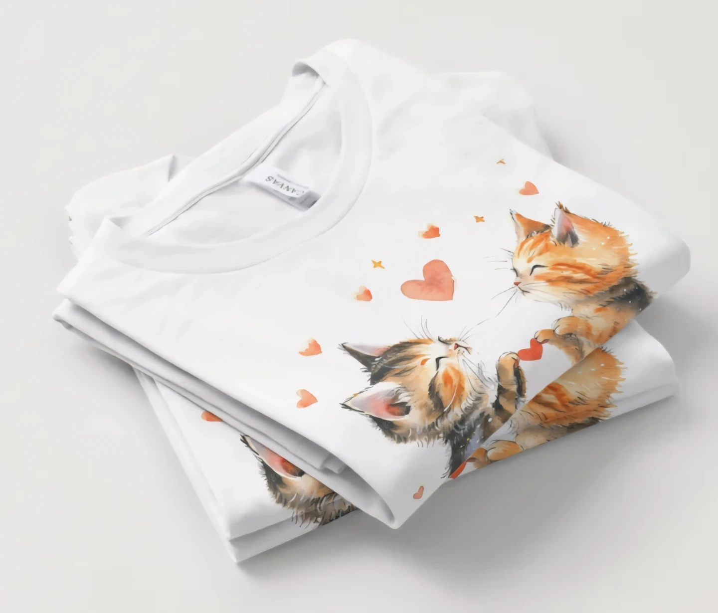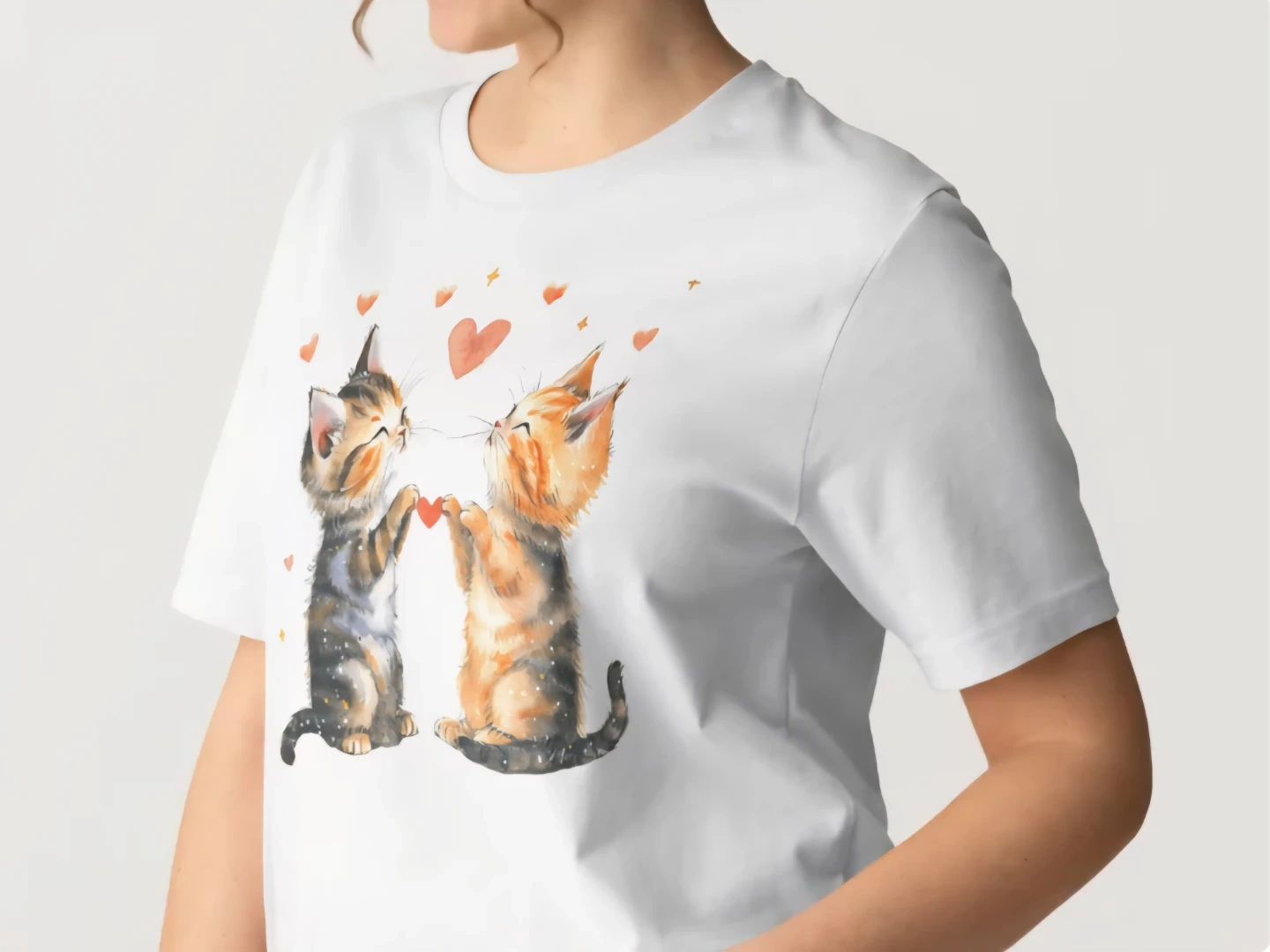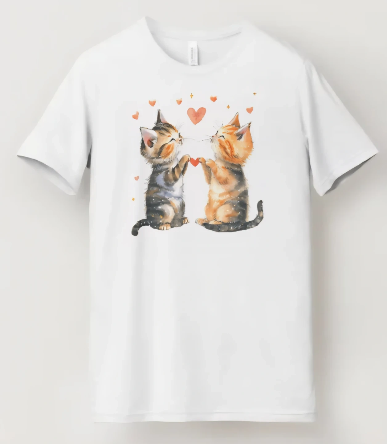This comfortable white t-shirt features a sweet watercolor graphic of two kittens sharing a heart. It's made from a soft cotton blend. Perfect for any cat lover!