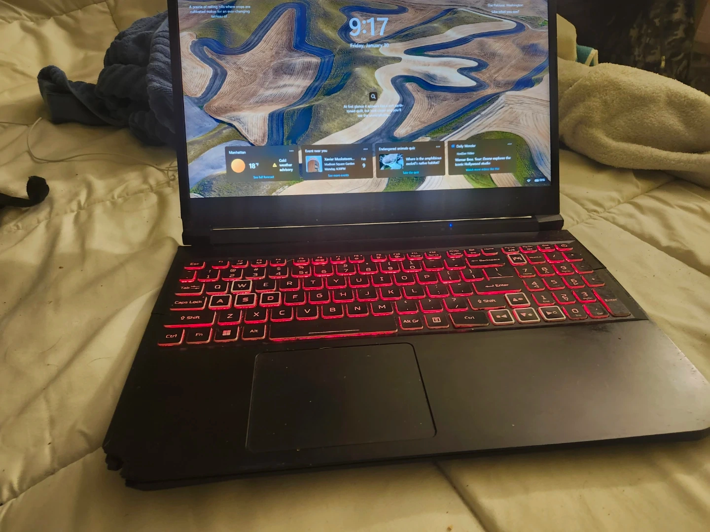 This black Acer gaming laptop features a red backlit keyboard. It comes with its original power adapter. Its lid is covered in various stickers. It just needs the screen border replacement