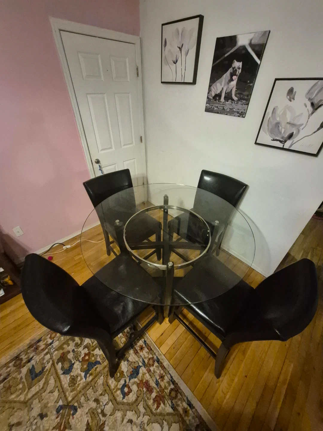 Round glass top dining table with four black leather chairs. Table has a metal base. This set seats four people comfortably. It's suitable for a kitchen or dining area.