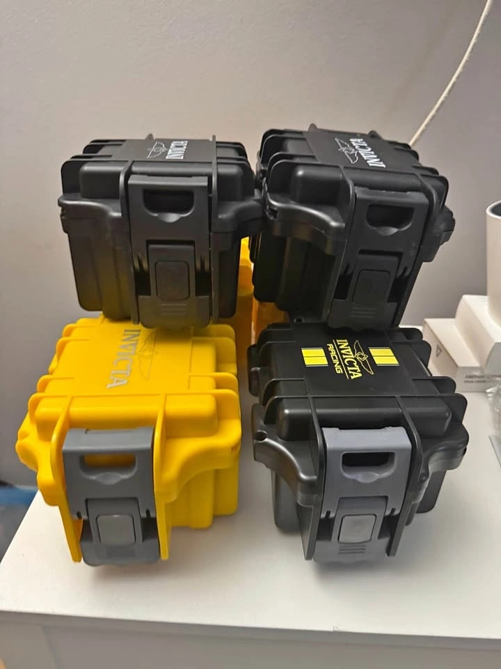 Set of 10 brand new Invicta watch slot cases. Assorted colors as shown. Brand new. Never used. Secure latch. No damage. Fits Invicta and other large watches. Selling only as a set. No individual sales.