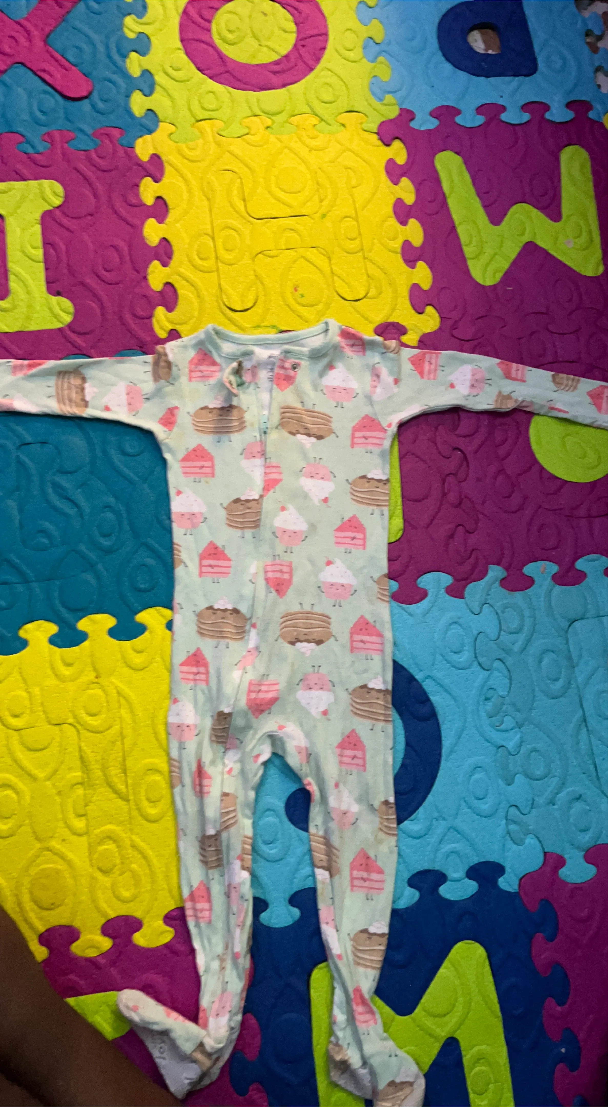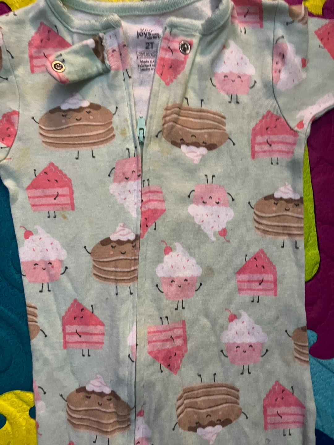 These adorable baby girl's footie pajamas from Joyful Pajamas feature a fun cupcake and pancake print. They're size 2T and have a convenient zipper closure. Made for comfortable sleep or play!