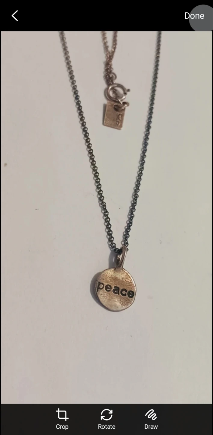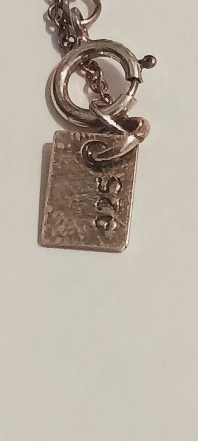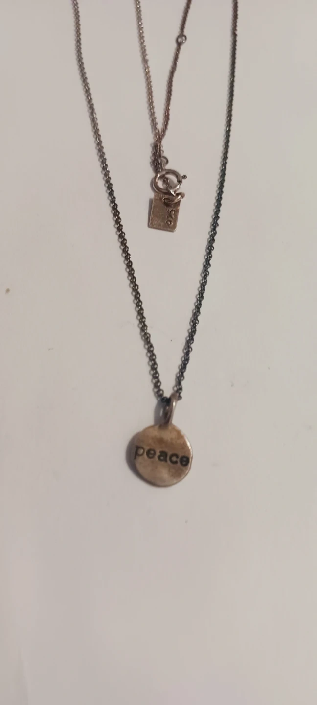 A sterling silver necklace featuring a round pendant with 'peace' stamped on it. The chain has a "925" tag near the clasp. This piece is perfect for everyday wear. 18" long. ALL MY PRICES ARE NEGOTIABLE !!