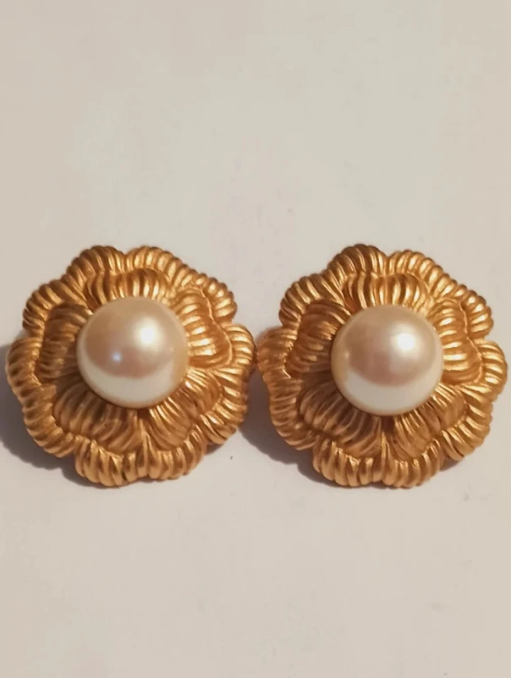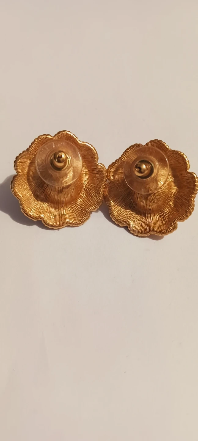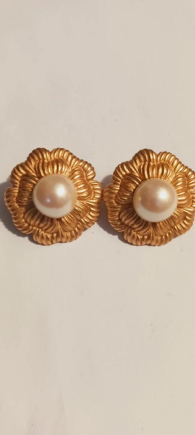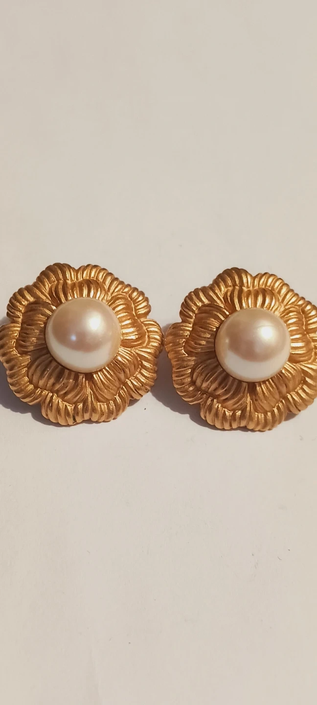 MONET signed pierced gold-tone flower 🌼 shaped earrings with a pearl center. They have a detailed floral design. Secure post backing. 1" diameter. Excellent condition, like new !! ALL MY PRICES ARE NEGOTIABLE !!