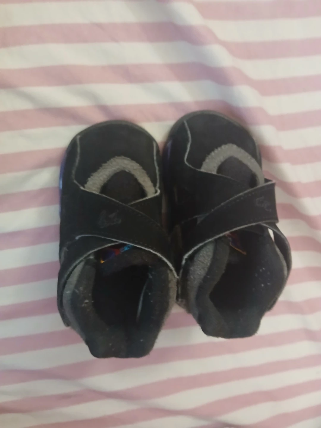 Black and gray Jordan toddler sneakers. Features velcro straps for easy on and off. The soles have a purple and teal accent. Perfect for little ones starting to walk!