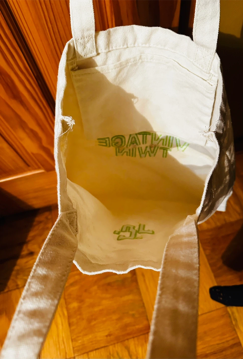 This is a reusable canvas tote bag from The Vintage Twin. It features a main compartment with an interior pocket. Made of durable cotton canvas.