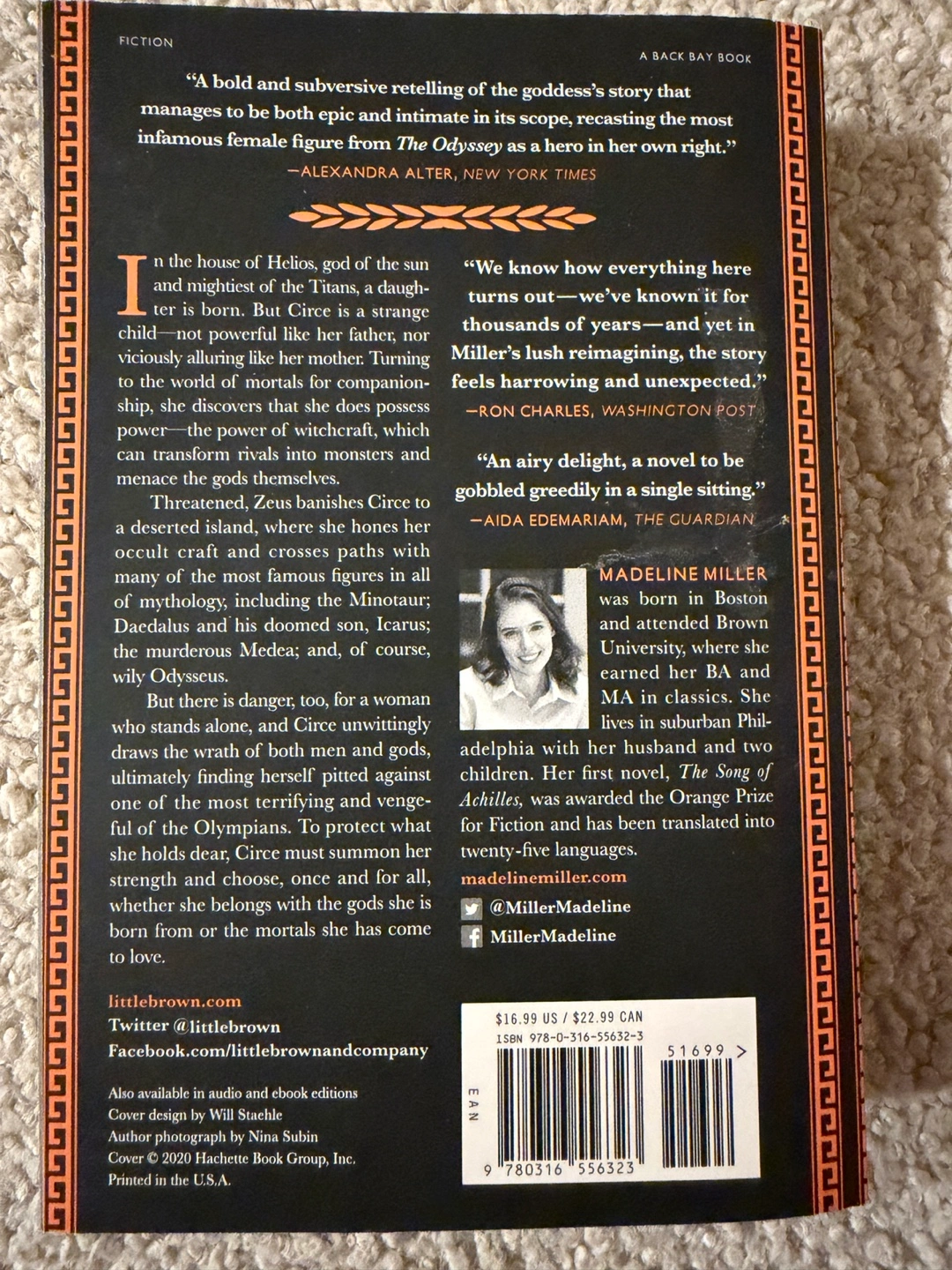 This is the paperback edition of "Circe" by Madeline Miller, a New York Times bestseller. It's a fictional retelling of Greek mythology centered on the sorceress Circe. Published by Back Bay Books.