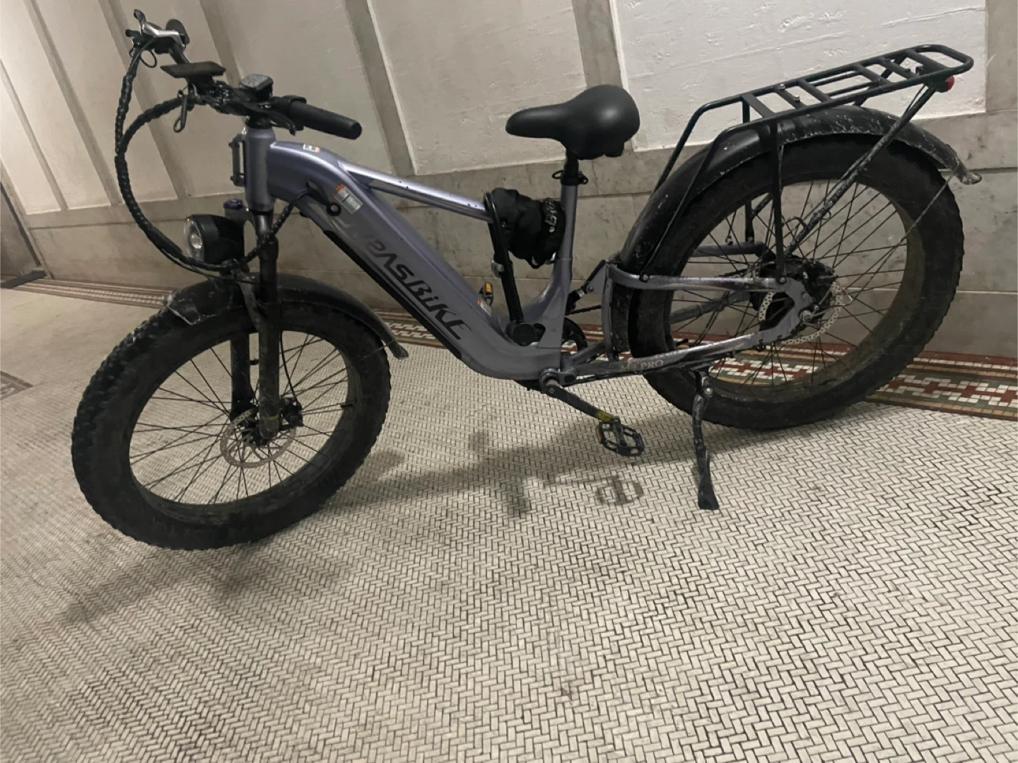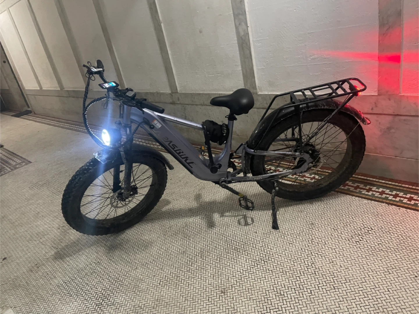 Aipas electric fat tire bicycle. Features a digital display showing speed, trip, odometer, and average speed 36mph+ Includes front and rear lights, and a rear cargo rack. Total mileage is 396.0 miles.