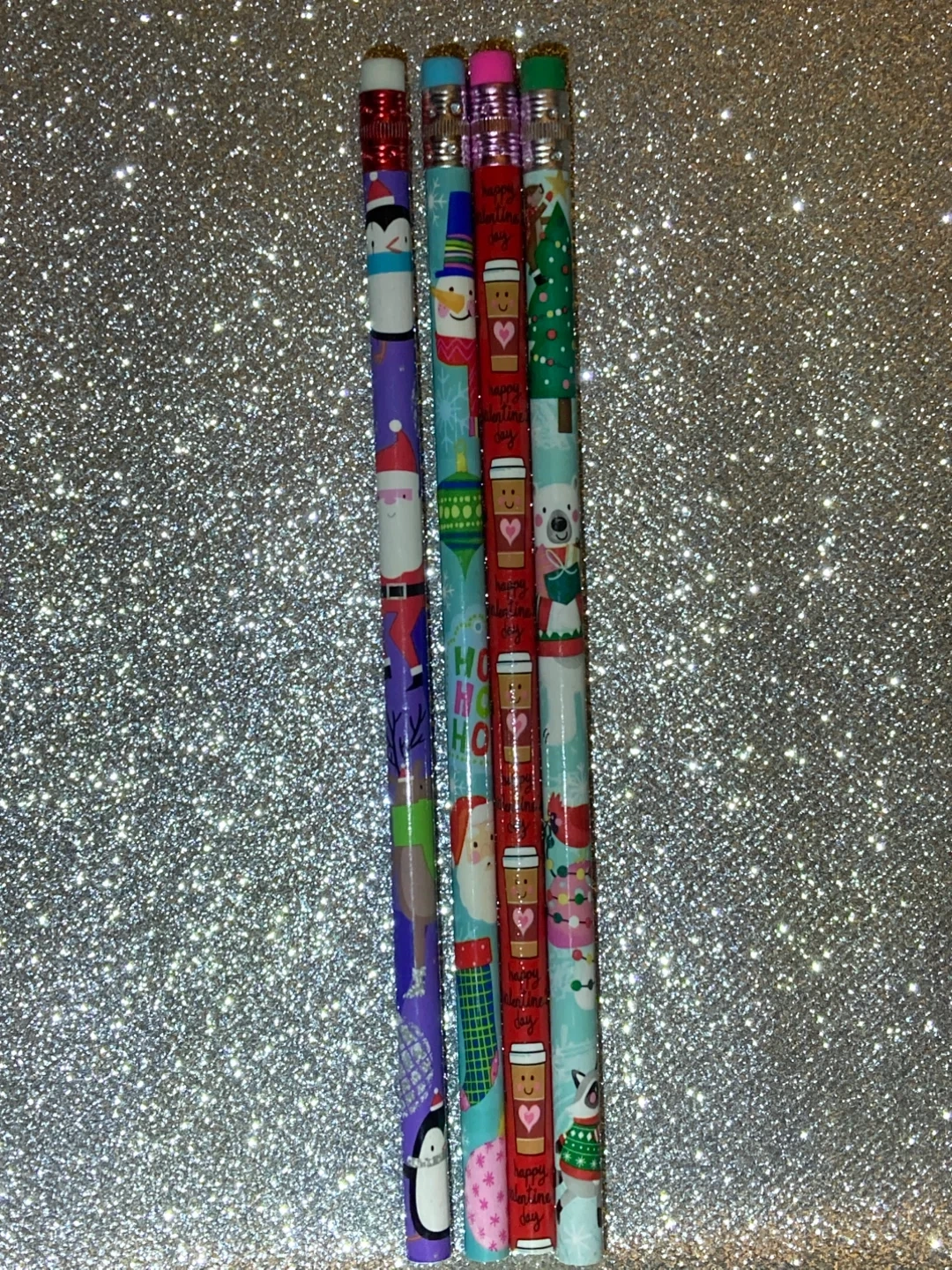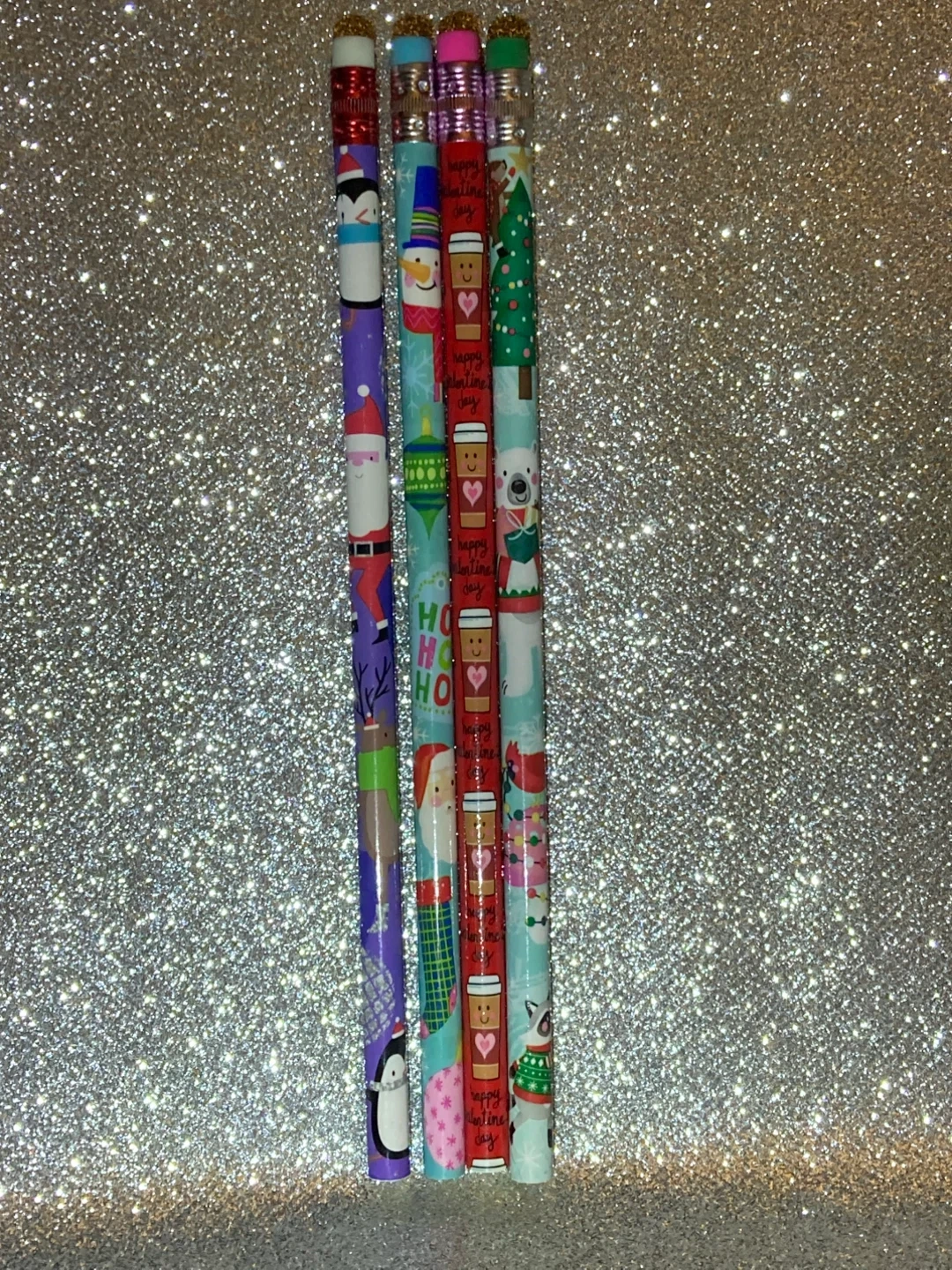 A festive set of 4 pencils featuring various holiday designs including Santa, snowmen, polar bears, Christmas trees, and Valentine's Day coffee cups. These pencils are perfect for seasonal writing or as fun party favors!