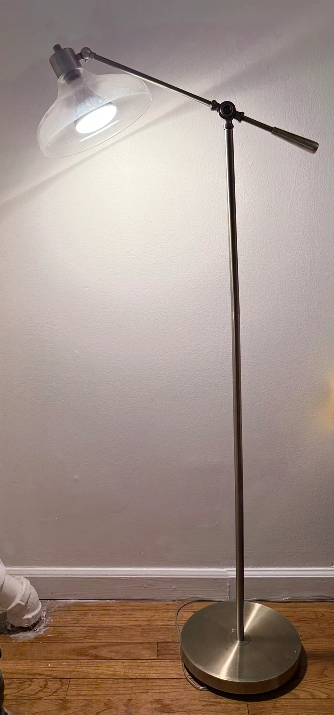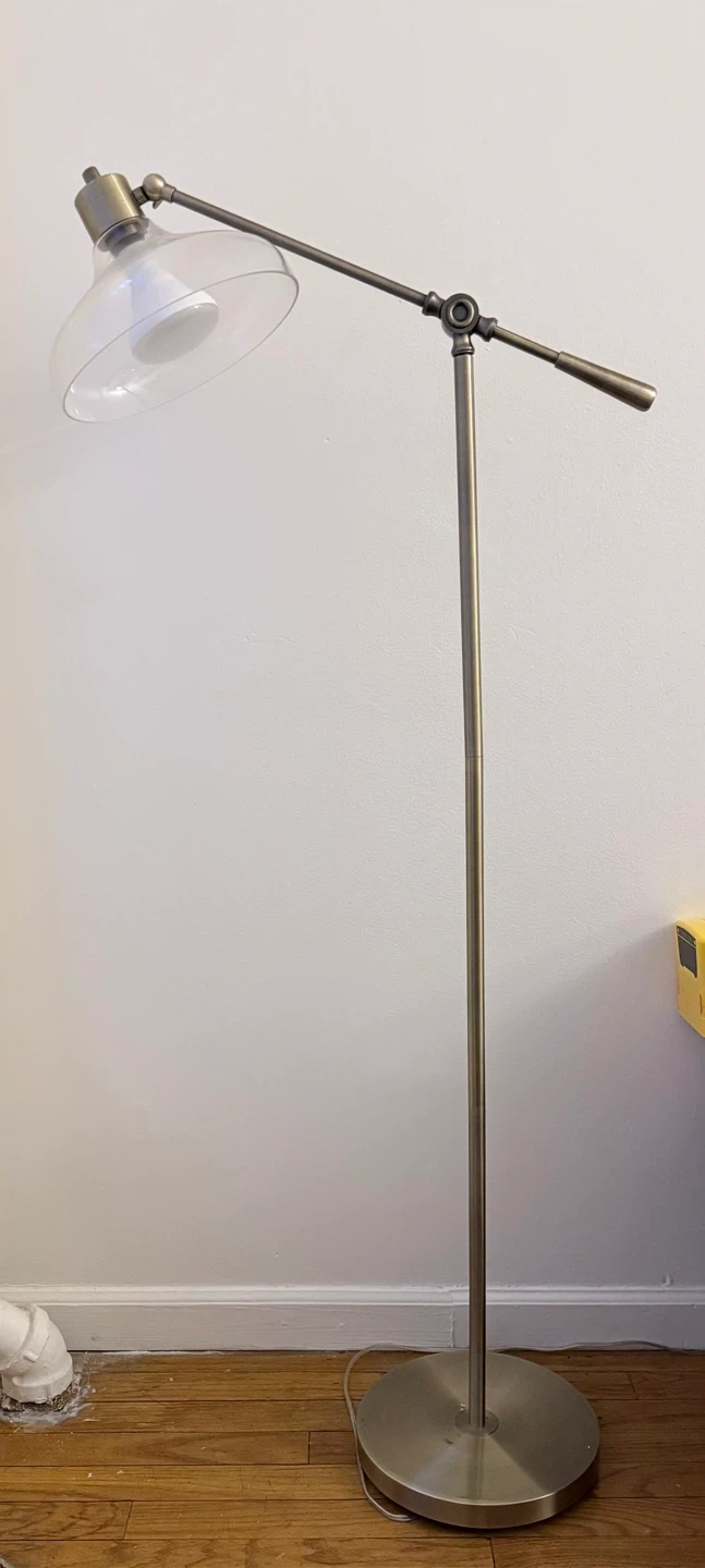This is a floor lamp with a very beautiful design, brushed metal finish. It features a clear glass shade and a weighted base for stability.