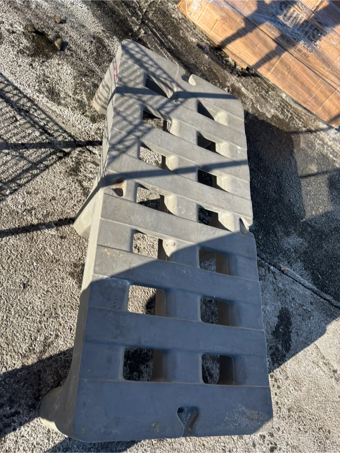 This is a set of gray plastic pallet risers. They're designed to elevate pallets for better airflow and access. Made of durable plastic.