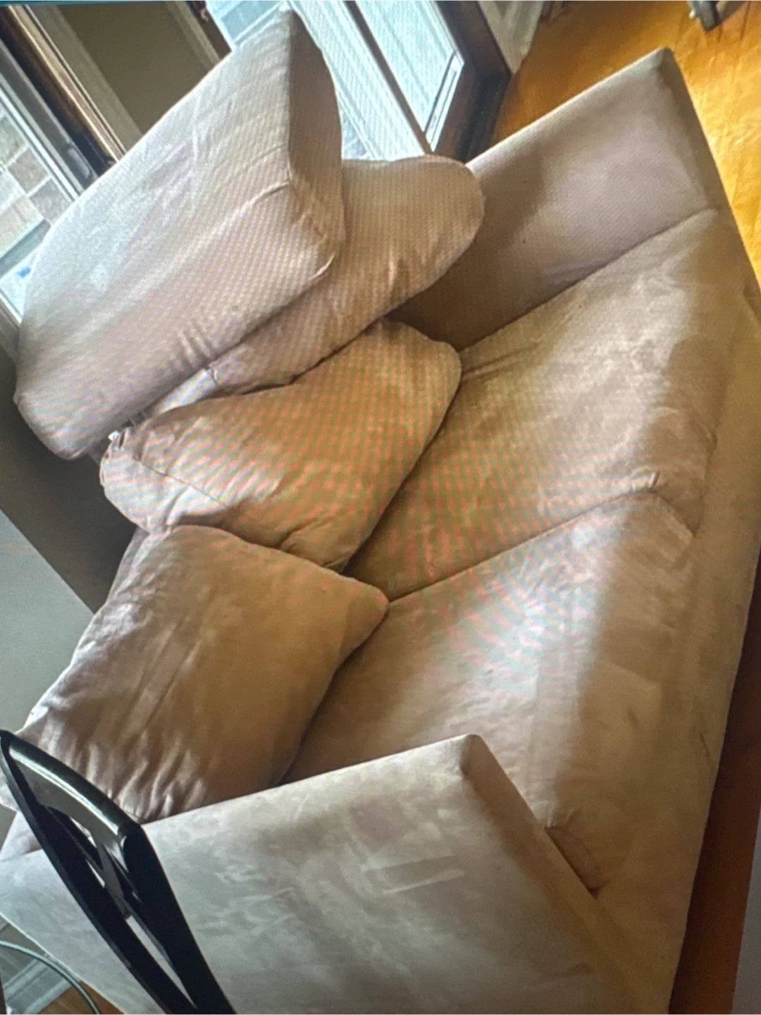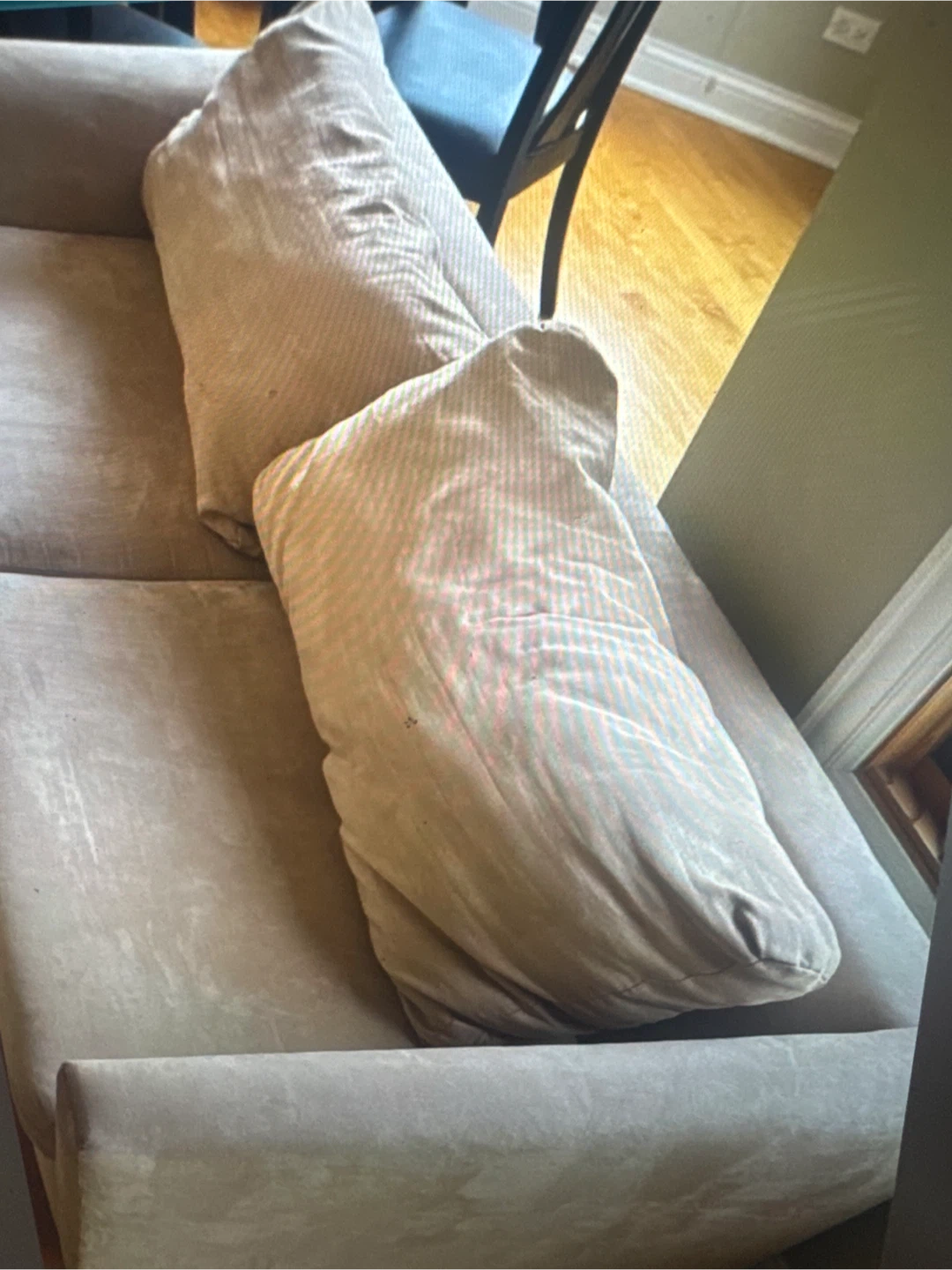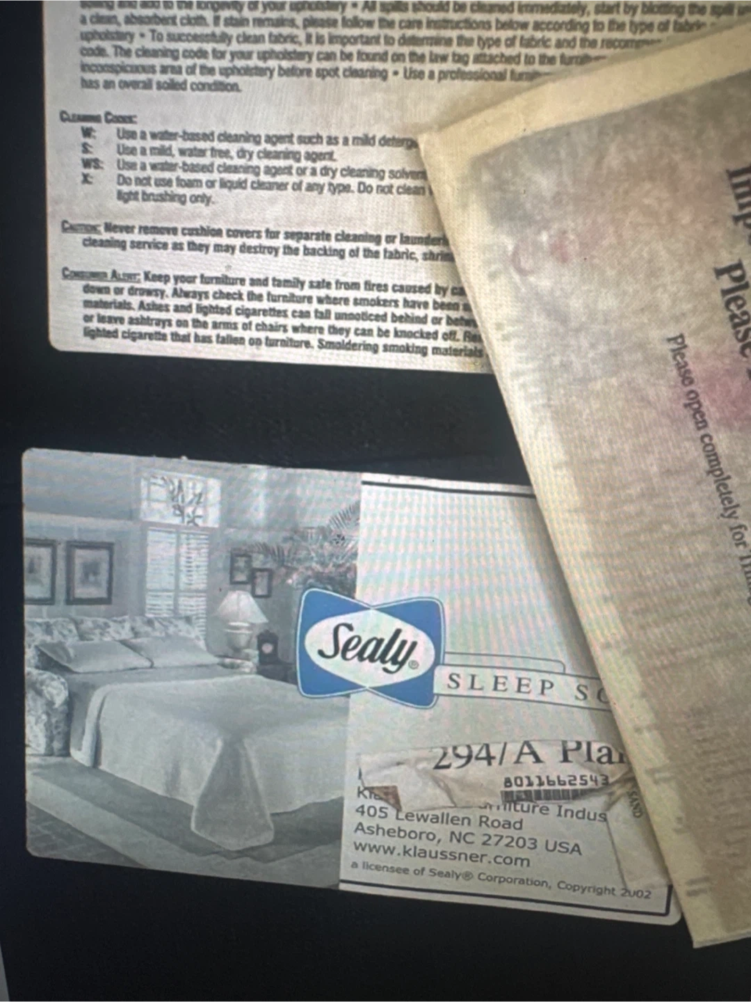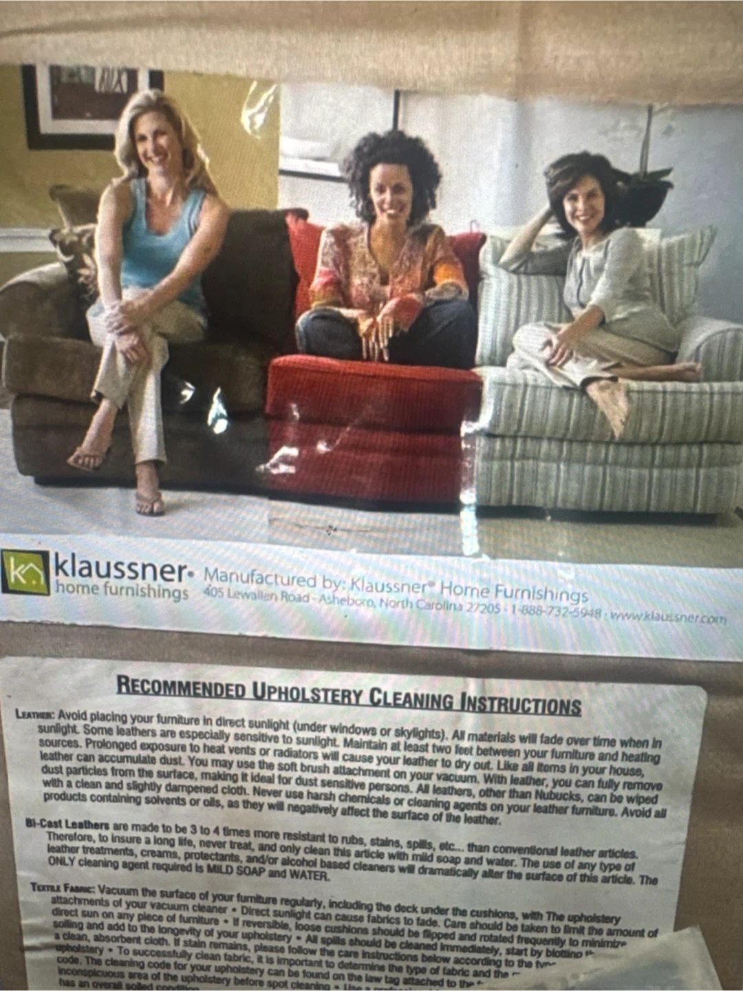 Klaussner sofa with multiple throw pillows. Upholstery is a light tan color. Includes care instructions for fabric and leather.
