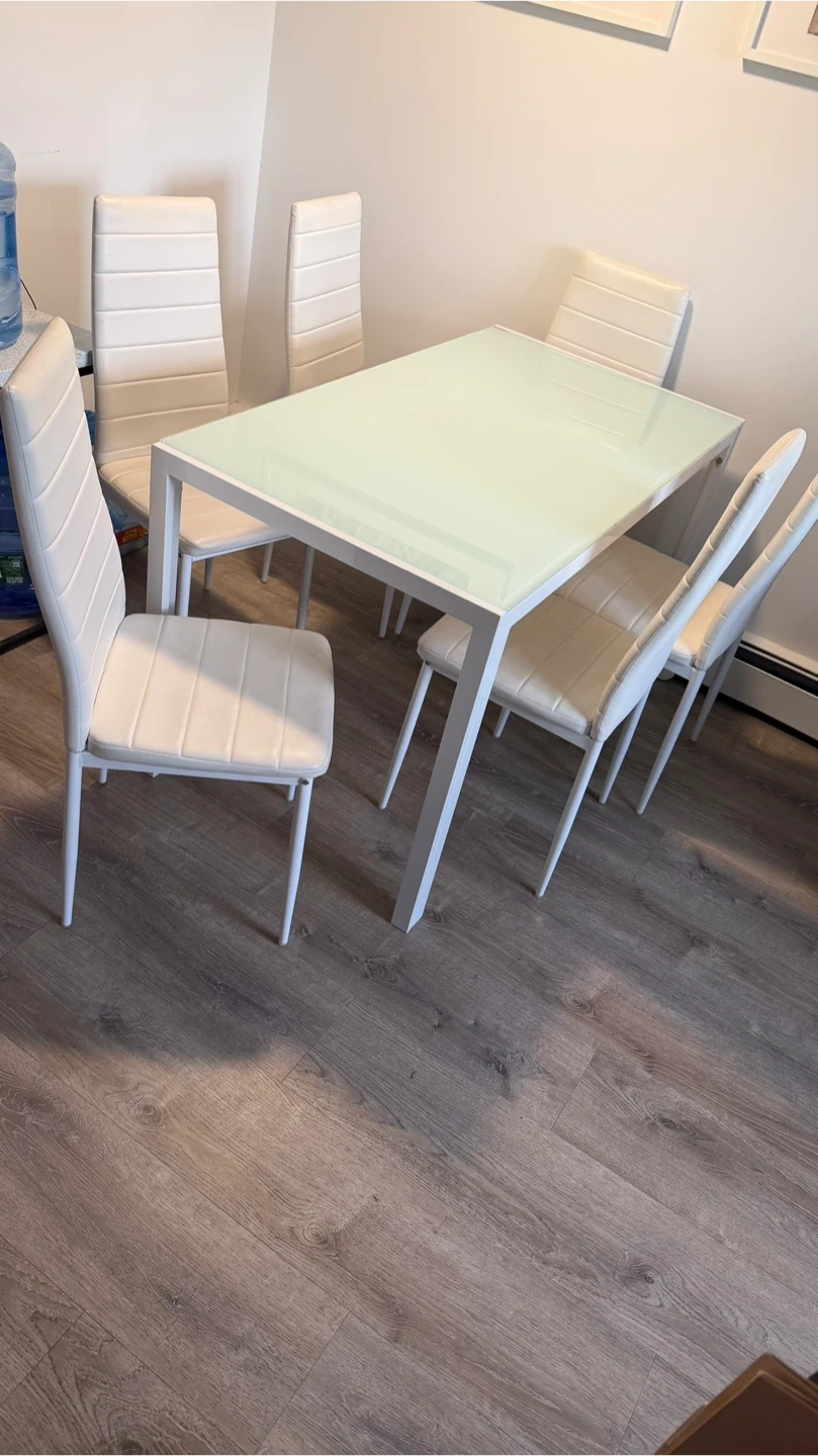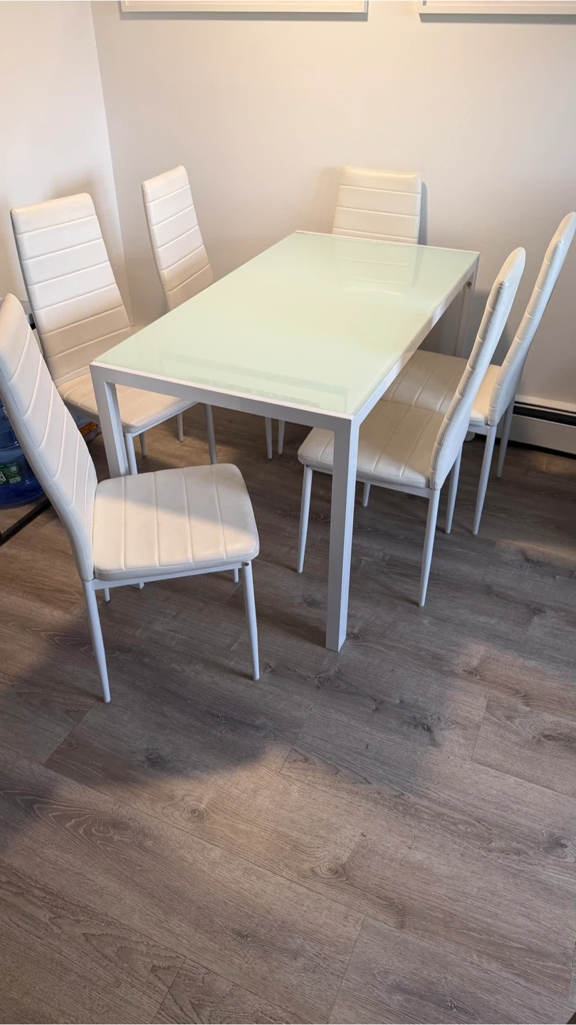 This is a 7-piece dining set featuring a modern design. It includes a glass-top table with a metal steel frame and 6 upholstered PU chairs. The table measures 51.25"L x 27.5"W x 29.25"H. This set is suitable for dining rooms or kitchens.
