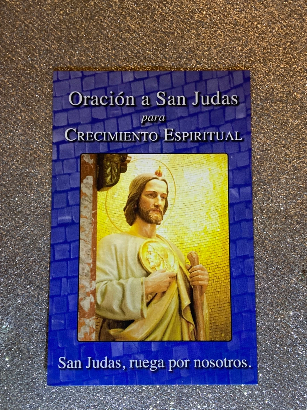 This is a prayer card for spiritual growth, featuring St. Jude. The card includes the prayer 'Oración a San Judas para Crecimiento Espiritual' and the phrase 'San Judas, ruega por nosotros.' It's a helpful item for personal devotion.