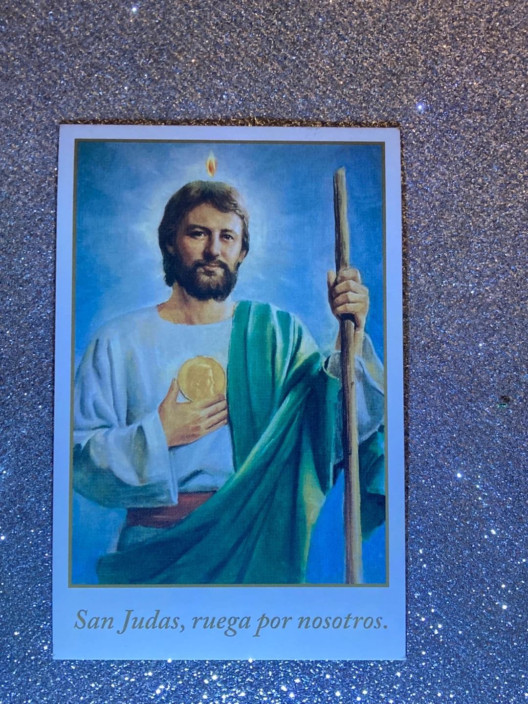 This is a religious card featuring St. Jude. The text at the bottom reads 'San Judas, ruega por nosotros.' It's a spiritual item.