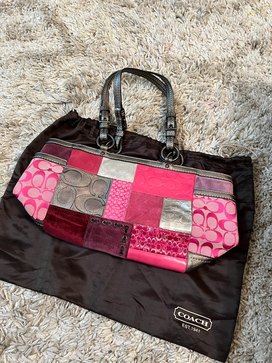 This is a Coach shoulder bag with a colorful patchwork design. It features a mix of fabrics and textures in shades of pink, purple, and silver. Includes Coach dust bag.