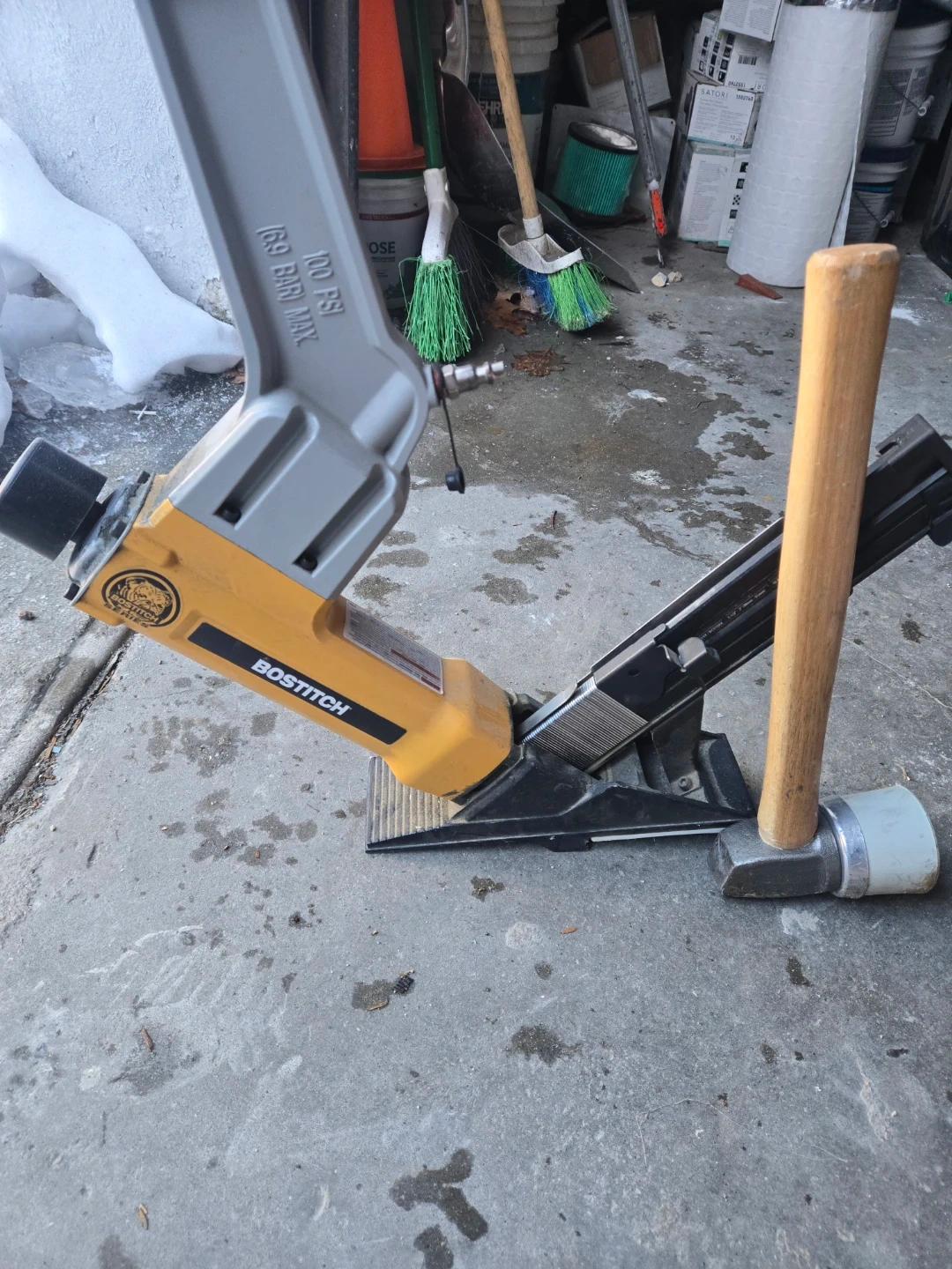 This is a Bostitch pneumatic stapler/nailer. It has a 100 PSI max operating pressure. It's designed for heavy-duty fastening tasks.